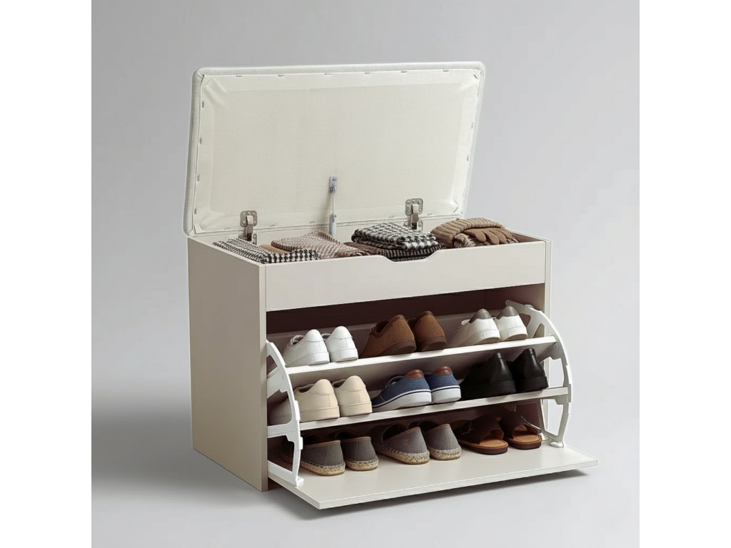 Botník s sedadlem VAULT s výsuvnými policemi a tichým zavíráním - ideální řešení pro ukládání obuvi a pohodlné sezení v jednom