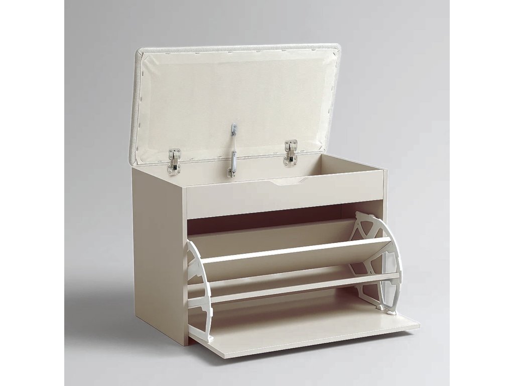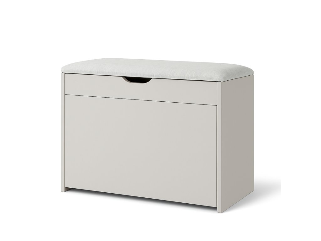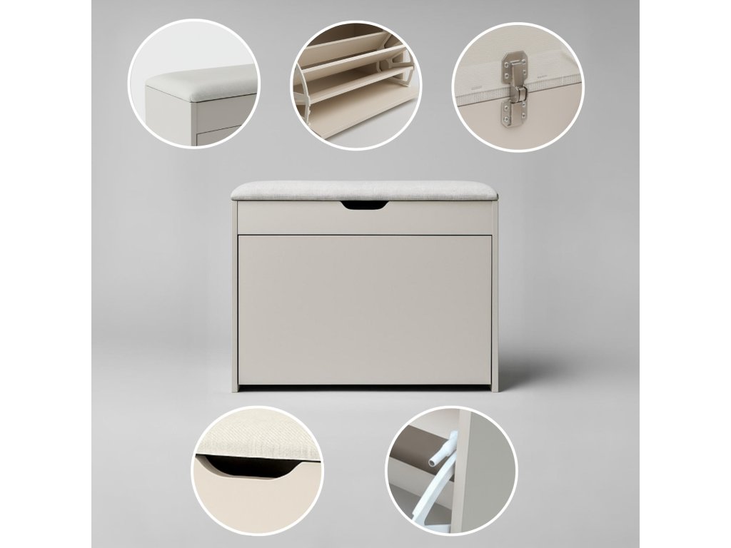 - Pohodlné sedadlo: Horní část botníku plní funkci sedadla, je potažena polyesterovým čalouněním, což zajišťuje pohodlí při obouvání. Výplň z polyuretanové pěny zaručuje správnou měkkost.