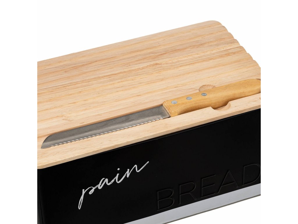 - Funkčnost 2 v 1: Tento černý chlebník není jen místem pro uchovávání chleba, ale také pohodlným prkénkem na krájení. Na vrchu prkénka se nachází výklenek - navržený speciálně pro nůž přiložený k zásilce s ostřím. Nůž se zuby vám usnadní krájení i teplého chleba.