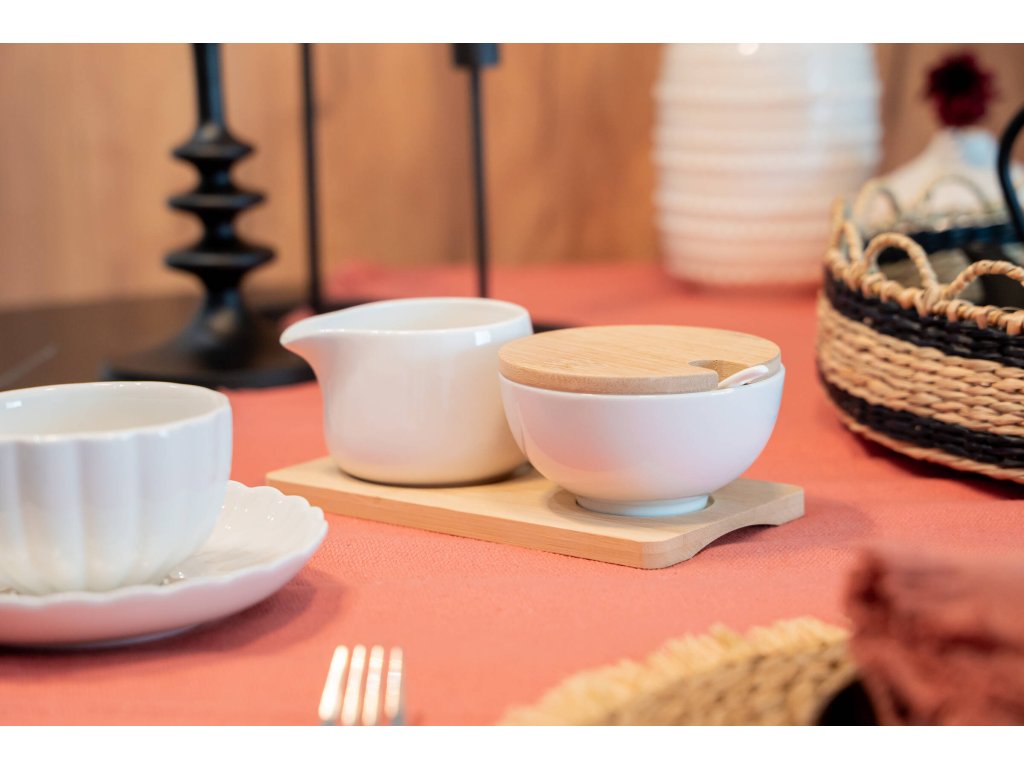 - Cukřenka a mléčník na podstavci z bambusu. Praktický set obsahující cukřenku, mléčník, bambusový podstavec a lžičku.