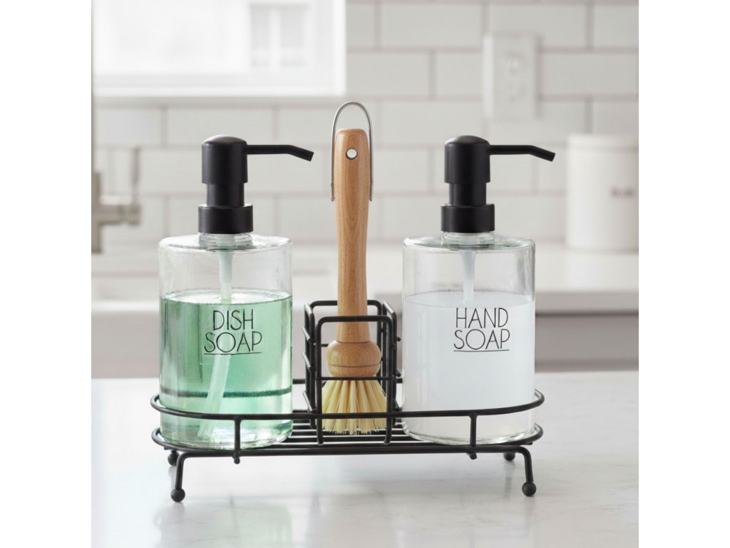 - Stylový stojan v sadě: Sada obsahuje elegantní stojan z práškově lakovaného kovu, který nejen udržuje dávkovače v pořádku, ale také dodává moderní charakter. Díky němu snadno uspořádáte prostor na pracovní desce.