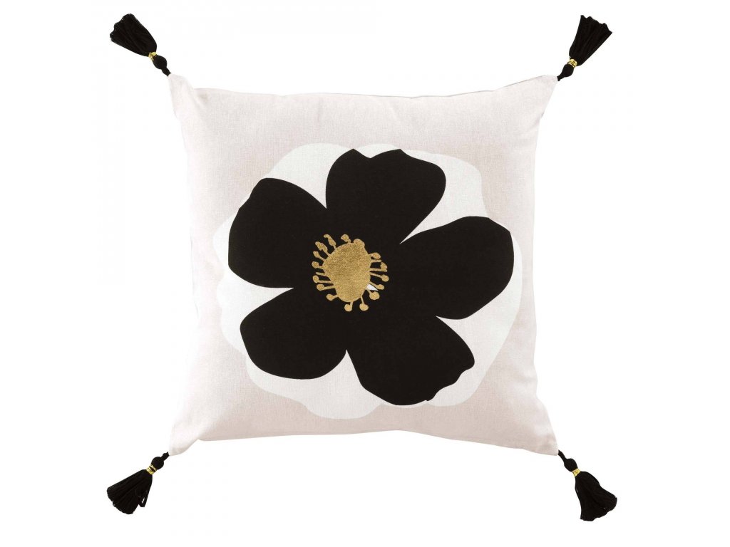 Dekorativní polštář s černým květem a třásněmi, elegantní dekorace interiéru