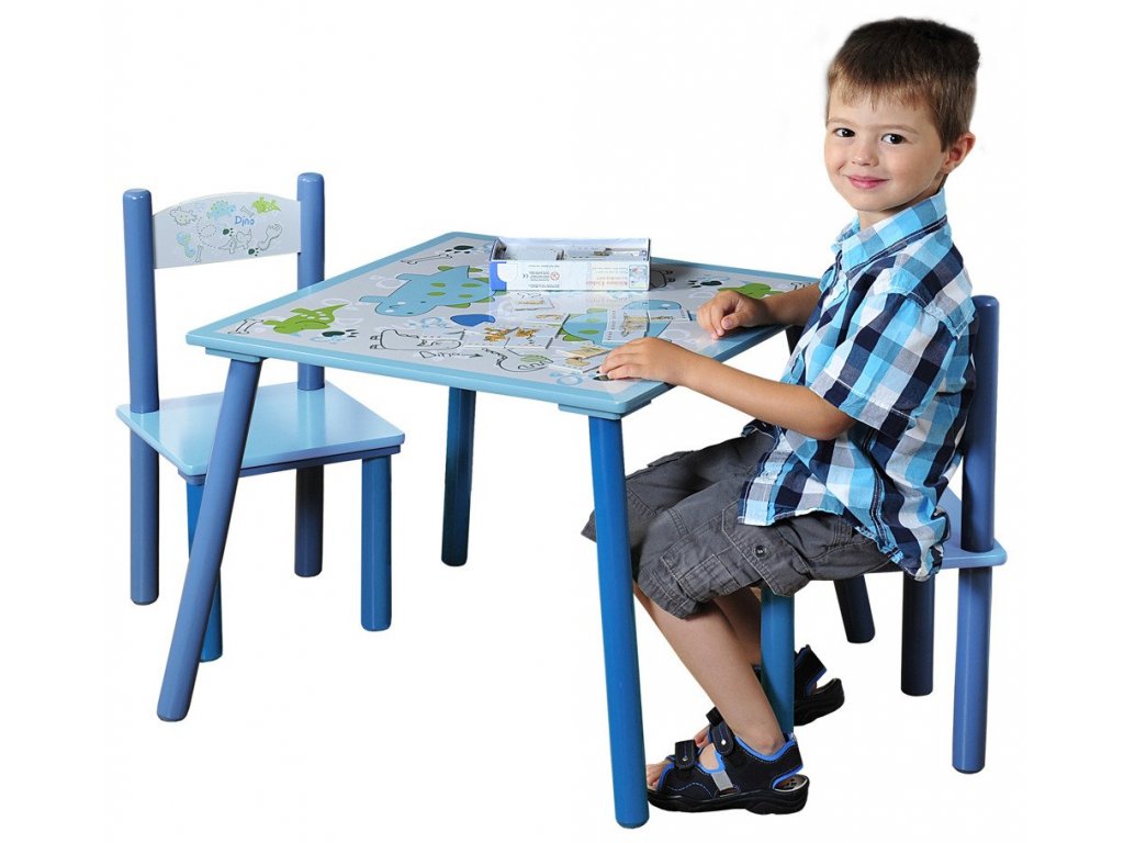 Dětský stůl se 2 židlemi ze dřeva, nábytek pro chlapce v modré barvě s motivem dinosaura
