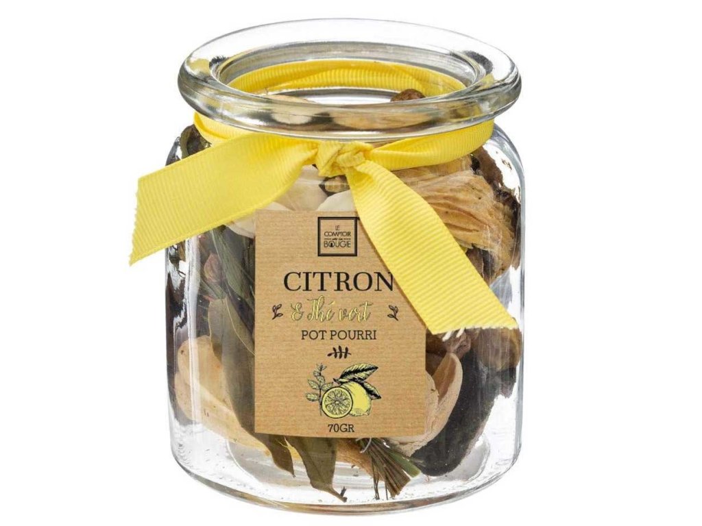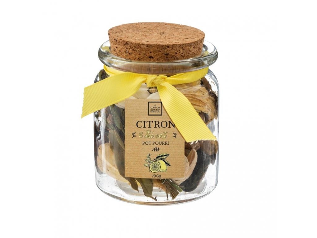 Vůně nastavená ve formě vynikající směsi potpouria umístěné ve skleněné nádobě s korkem, můžete volně nastavit vůni uvolněnou tím, jednoduše rozbalit korku do nádoby, aby si čerstvé citronové aroma. Ideální pro obývací pokoj, ložnici nebo koupelnu. A pokud chcete pozdravit své hosty neobvyklou vůní již od prahu, vložte ji na chodbu.