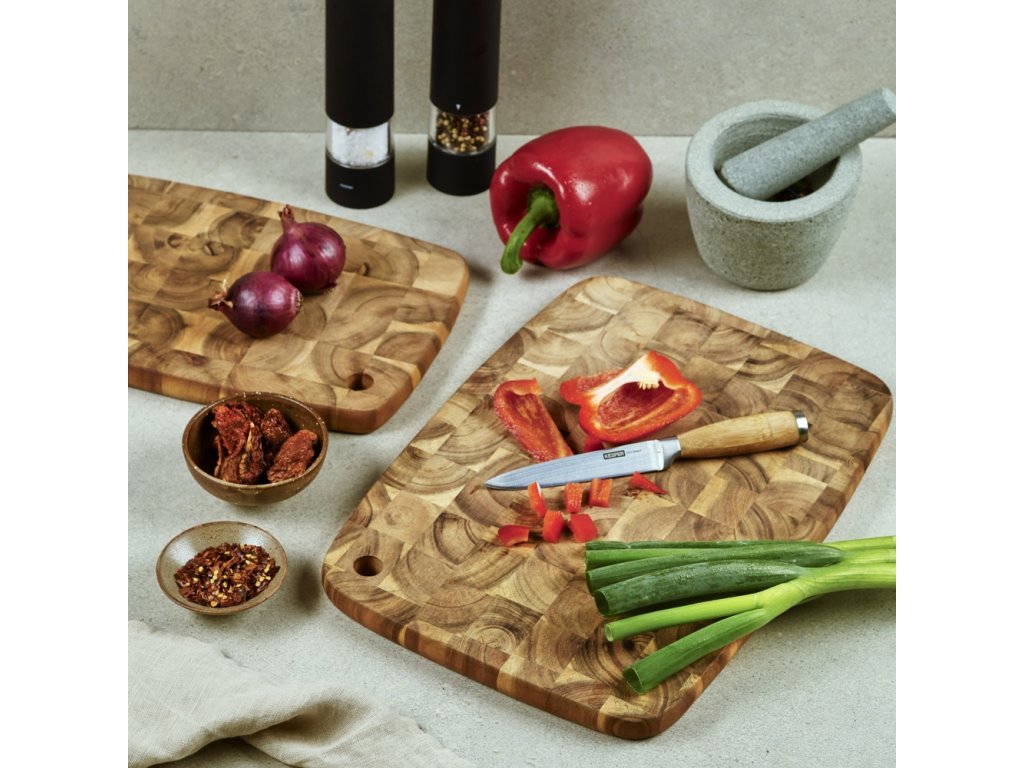 - Vysoká kvalita materiálů: Desky jsou vyrobeny z akáciového dřeva s certifikátem FSC®, což zaručuje, že surovina pochází z odpovědně spravovaných lesních zdrojů. Výjimečná tvrdost a hustota akácie je činí mimořádně odolnými vůči hlubokým rýhám a mechanickému poškození, což je činí ideální volbou pro intenzivní každodenní použití.