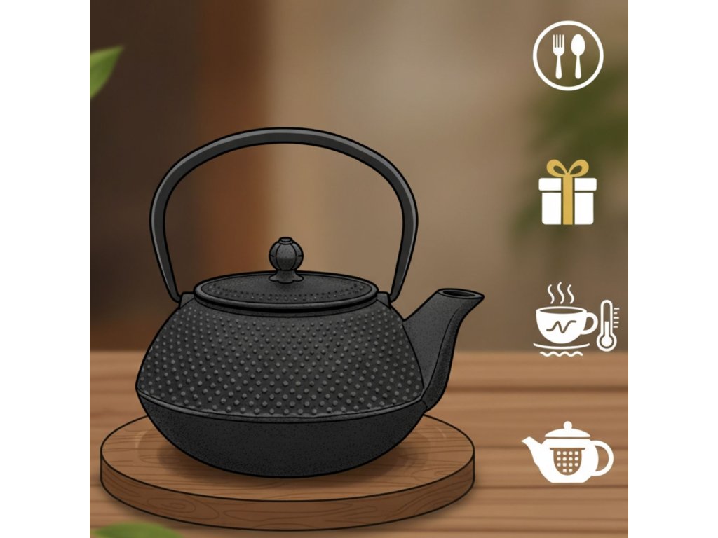 - Litinové tělo + víko: Masivní litina pomáhá déle udržet teplotu čaje během přípravy a servírování.