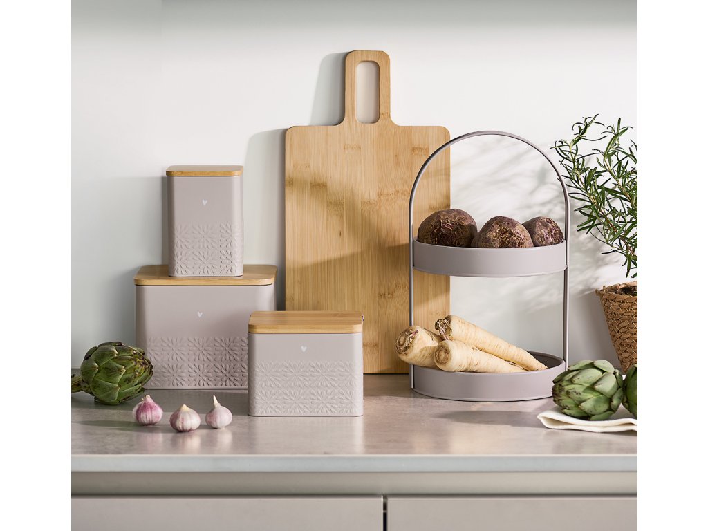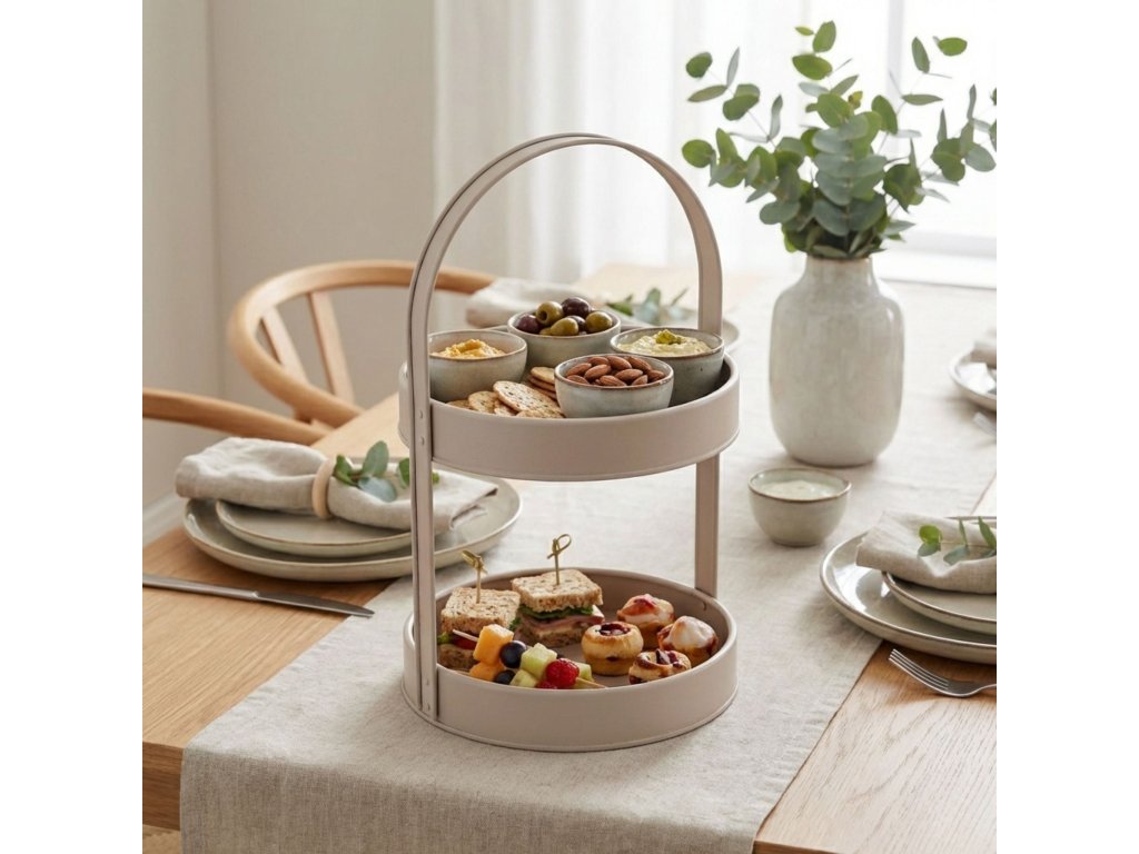 - Praktičnost a funkčnost: Patrový tác greige kovový ZELLER je ideálním řešením pro skladování a servírování občerstvení, ovoce nebo pečiva. Díky dvěma úrovním získáte další prostor pro různé produkty, což je obzvlášť užitečné během společenských setkání.