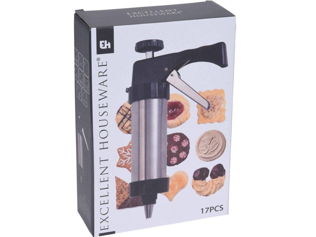 Výrobce cookie z nerezové oceli je výrobek značky EH Excellent Houseware známý svou širokou škálou domácích doplňků. Sada se skládá z nůžky pro pohodlné stlačení sušenek, 8 překryvů pro sušenky různých tvarů a 8 tipů pro zdobení. Stačí dát část těsta nebo námrazy dovnitř, vyberte ten správný tip a jste hotovi! Použití kuchyňského robotu je velmi jednoduché, takže můžete také pozvat děti k přípravě cookies, kteří se určitě baví!