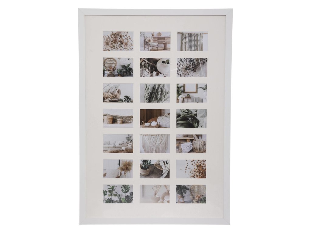 Fotorámeček ELTENNE, 21 fotek rozměru 10 x 15 cm, bílý je skutečnou galerií pro vaši zeď. Do tohoto rámečku se vejde až 21 fotografií v nejoblíbenějším formátu 10x15 cm. Rámeček je vyroben z MDF, je jednoduchý a bez ozdob. Výrobek se dodává v bílé barvě. Vyberte si z nich ten, který se bude hodit k designu vašeho pokoje a bude ladit nebo kontrastovat s barvou stěn. Rozměr 100 x 70 cm. Rozměry rámu jsou velké, takže vámi vytvořená dekorace bude viditelná a zaujme vaše hosty i z dálky.