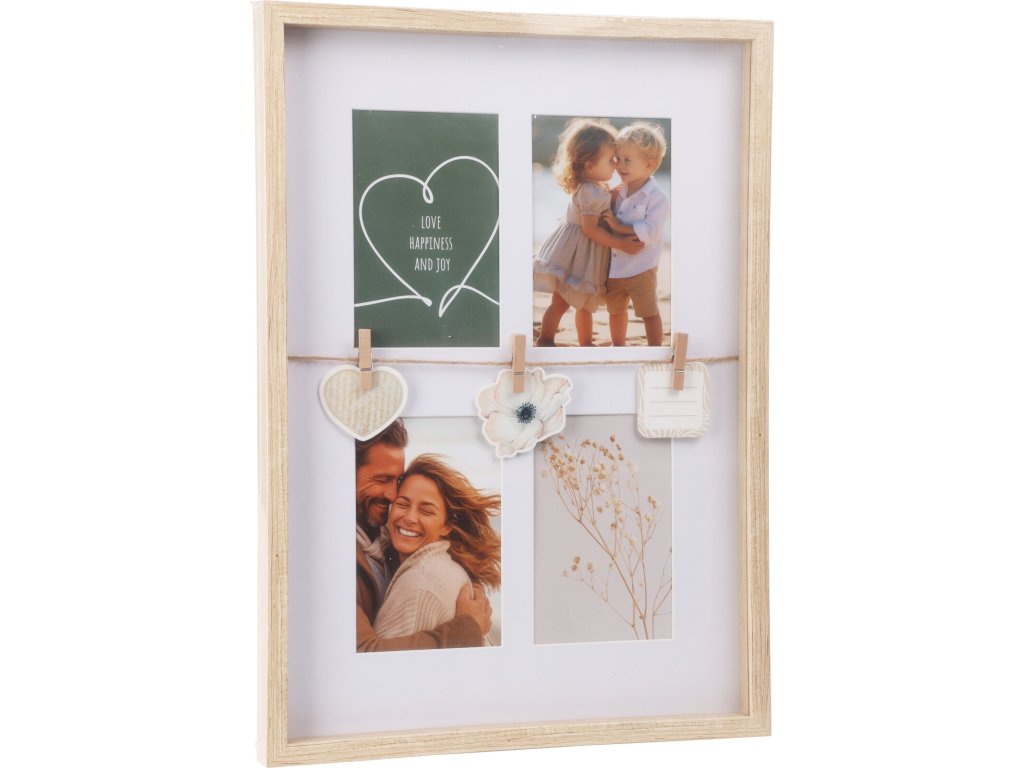 - Praktické příslušenství: Sada obsahuje kovový háček na zavěšení a tři dřevěné klipsy, což usnadňuje výměnu fotografií a personalizaci dekorace.