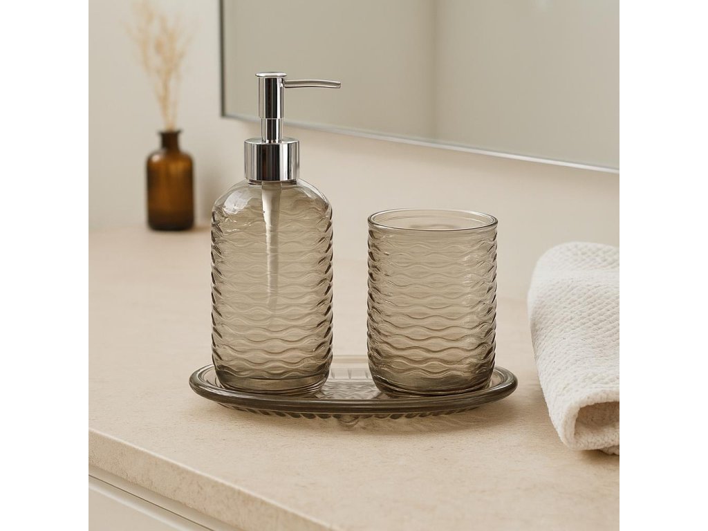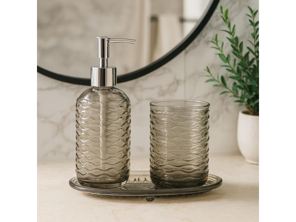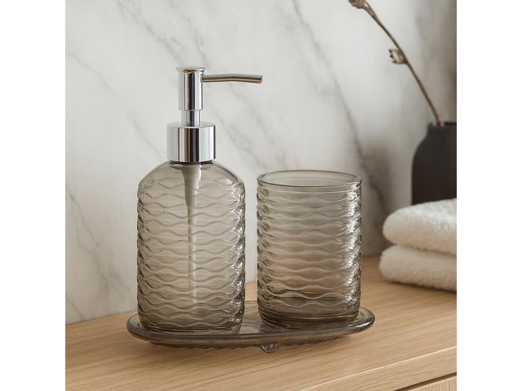 Kompletní koupelnová sada s dávkovačem, hrnkem a mýdlenkou ze sodového skla - elegantní a funkční sada do každé koupelny