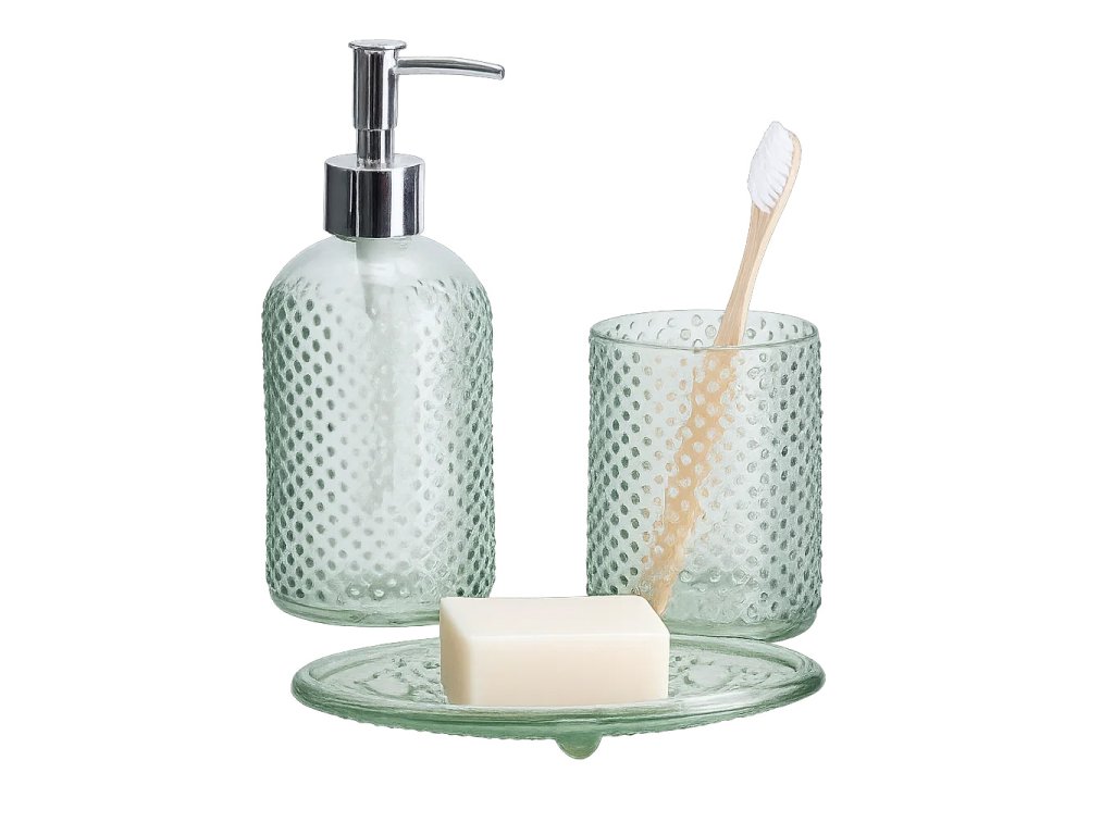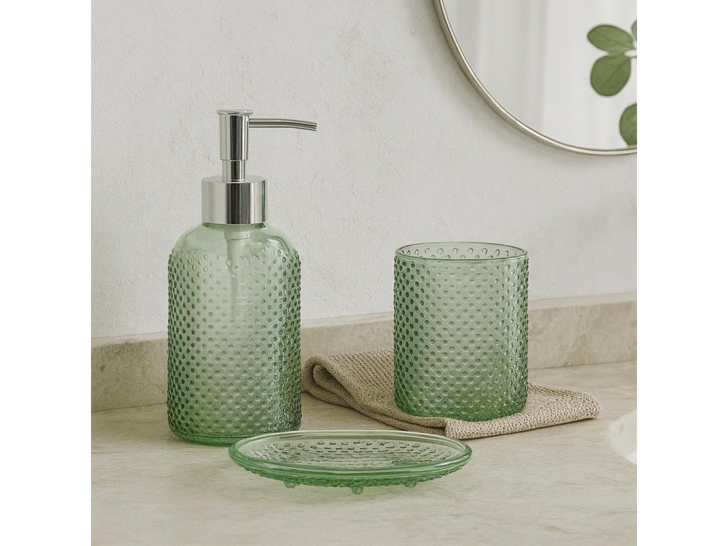 Kompletní koupelnová sada s dávkovačem, hrnkem a mýdlenkou ze sodového skla - elegantní a funkční sada do každé koupelny