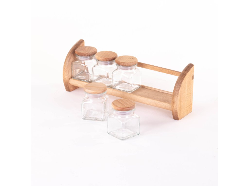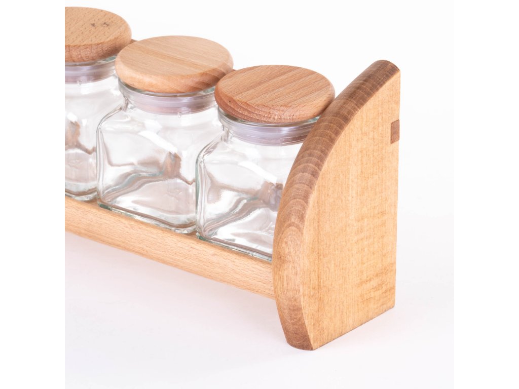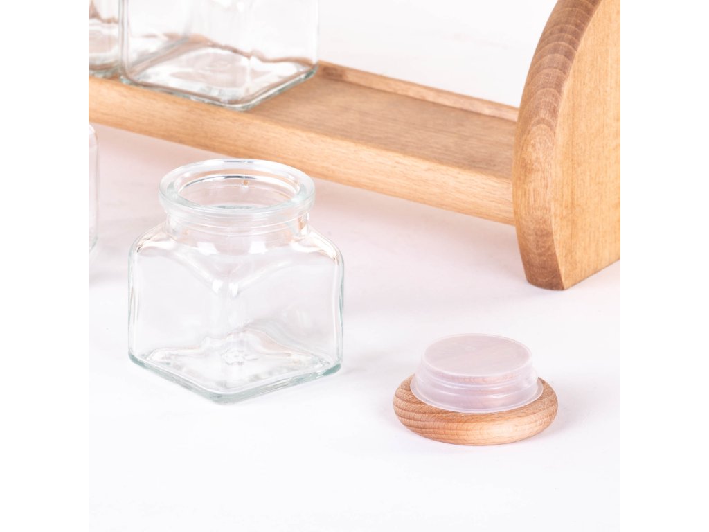 - Vysoce kvalitní materiály: Police je vyrobena z bukového dřeva, což zajišťuje její trvanlivost a estetický vzhled. Skleněné nádoby se těsnými dřevěnými víčky účinně chrání aroma koření, čímž zachovávají jejich čerstvost po delší dobu.