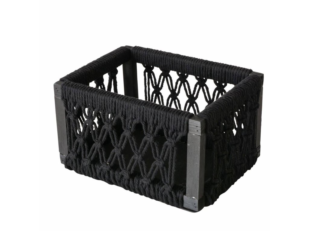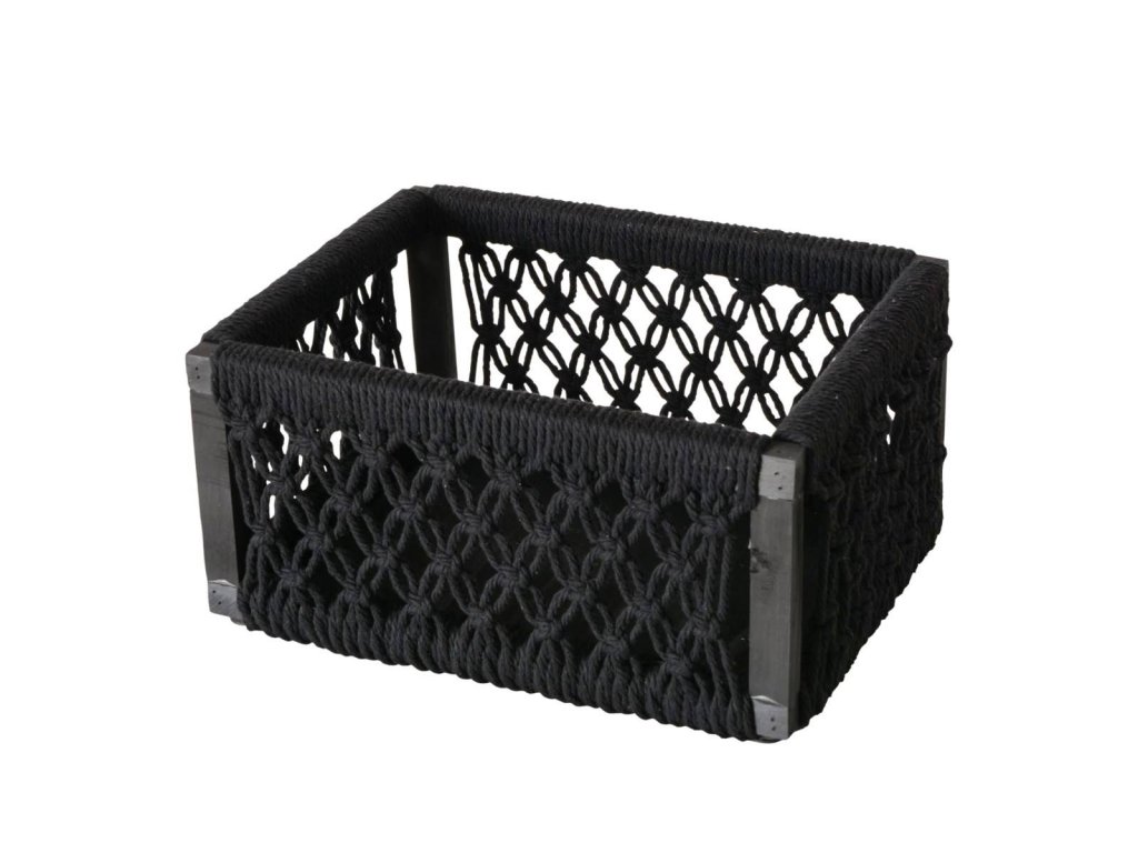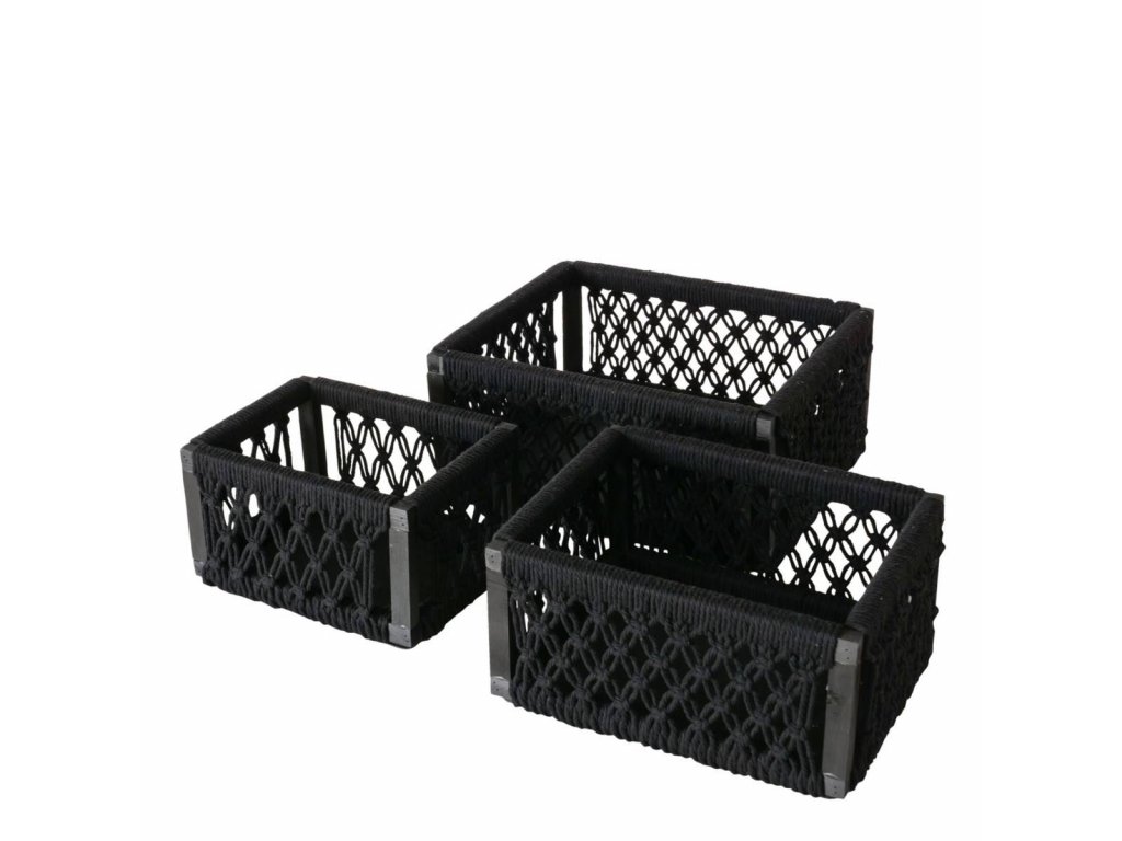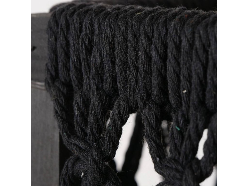 - Černé plétěné lanko: Na borovém rámu je umístěné plétěné lanko z bavlny, které vytváří dekorativní síť. Koše mají elegantní černou barvu, která se hodí do různých stylů interiéru. Nebudou vás rušit, takže uskladnění bude diskrétní.