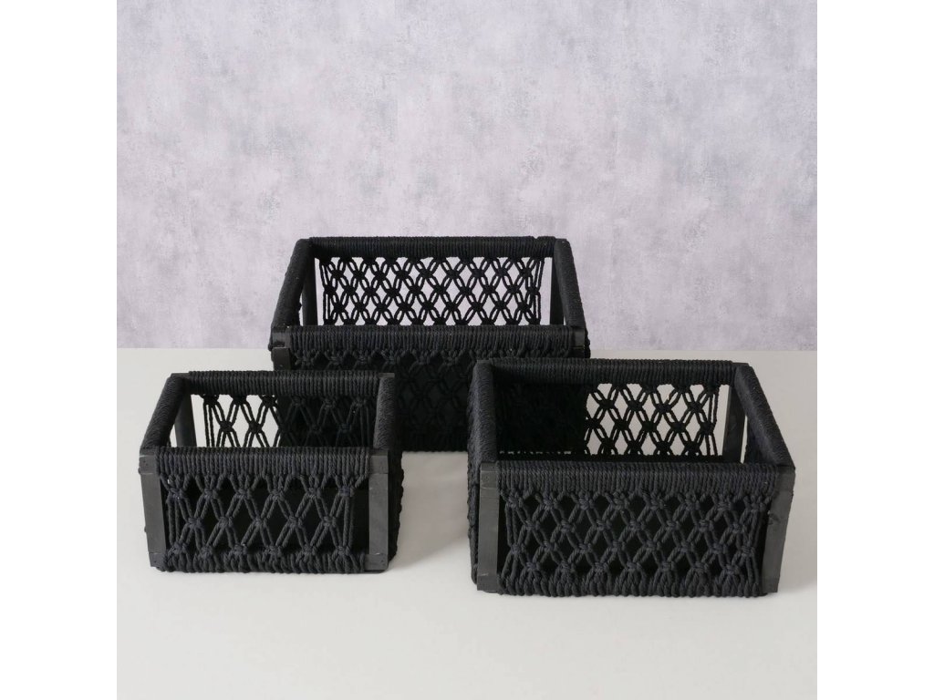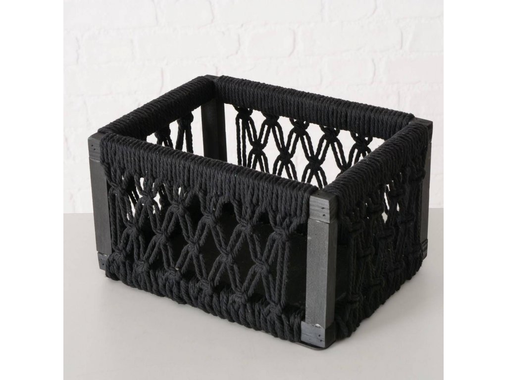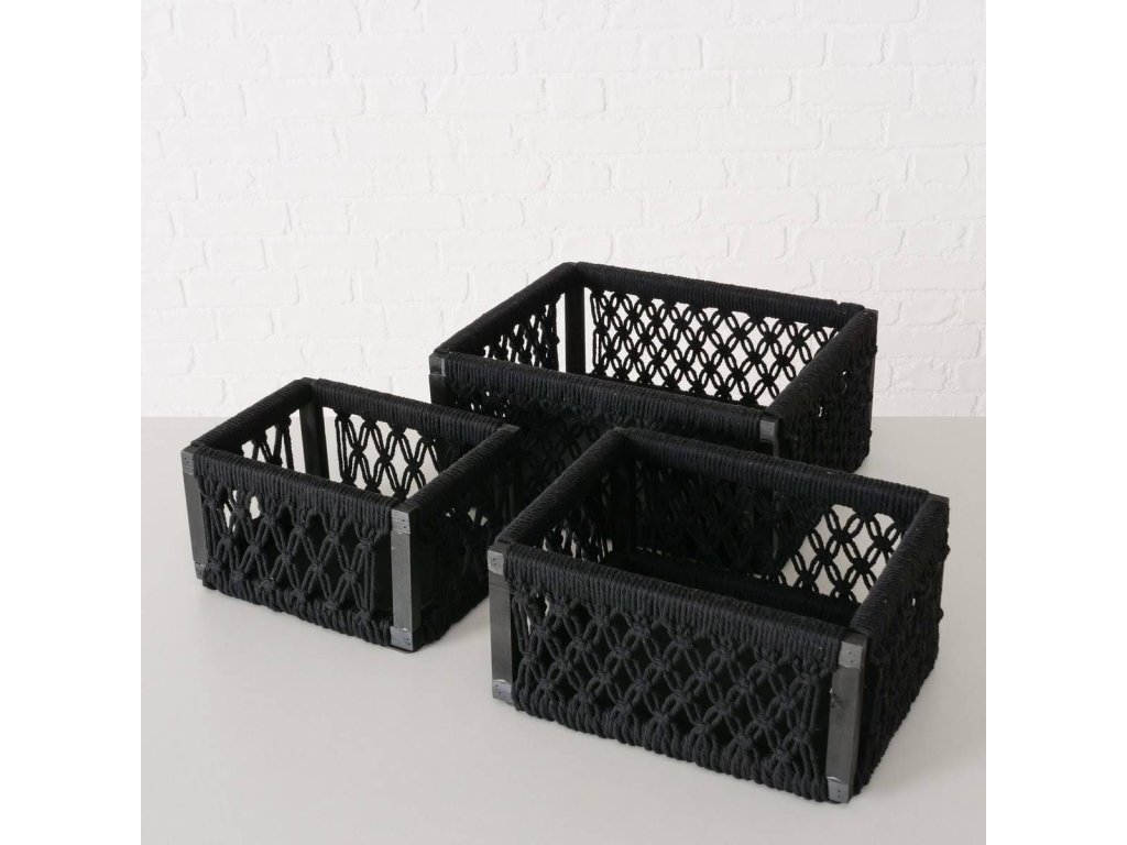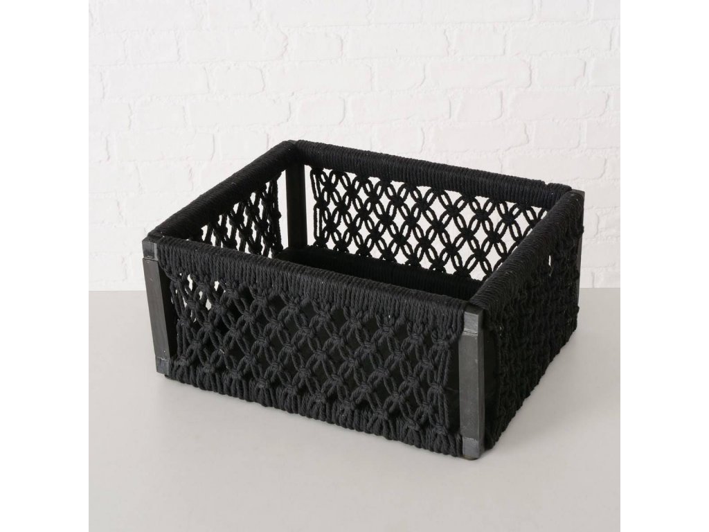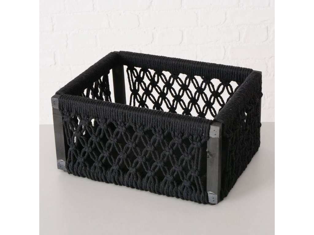 - Černé plétěné lanko: Na borovém rámu je umístěné plétěné lanko z bavlny, které vytváří dekorativní síť. Koše mají elegantní černou barvu, která se hodí do různých stylů interiéru. Nebudou vás rušit, takže uskladnění bude diskrétní.