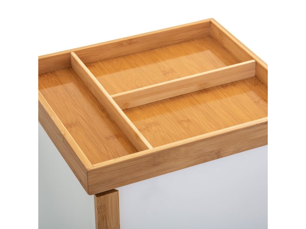 Navrženo v ekonomickém skandinávském stylu, tato bílá komoda vám umožní pohodlně a bezpečně používat koupelnu uložit své příslušenství, kosmetiku a ručníky. Tato velmi funkční bambusová police je vybavena důmyslnou přihrádkou, kterou lze použít jako extrémně funkční kosmetický organizátor. Předložená koupelnová skříňka pochází ze série velmi důmyslného a praktického koupelnového nábytku vytvořeného slavnou značkou Five. Bambusová police zaujme nejen svou praktickou konstrukcí, ale také fantastickým, velmi módním designem, inspirovaným populárním skandinávským stylem. Tato jednoduchá zásuvková komoda se proto hodí do různých uspořádání, kde se používají přírodní suroviny. Bambusové police a regály z bambusu jsou také nejpraktičtější koupelnový nábytek. Bambusové vlákno je odolné vůči vodě, vlhkosti a vysokým teplotám. Tato bílá police nepochybně vydrží obtížné podmínky koupelny dobře.Vlastnosti výrobku: