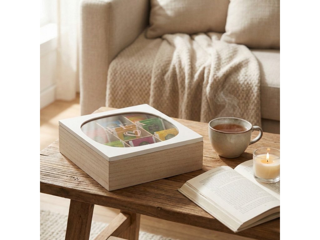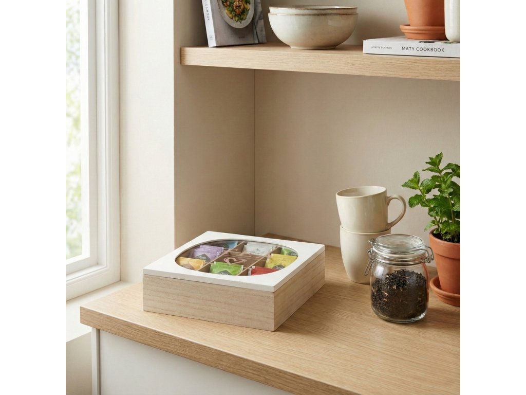 - Praktické skladování: Čajová dóza ZEN o rozměrech 24 x 24 x 7 cm je ideálním řešením pro organizaci čajů v sáčcích. Díky devíti přihrádkám má každý čaj své místo, což usnadňuje rychlý přístup k oblíbeným chutím.