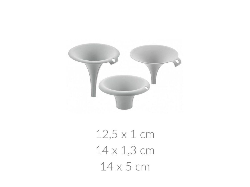 - Různé velikosti a průměry: V sadě najdete různé velikosti a průměry trychtýřů: (průměr otvoru x průměr trubice) S - 12,5 cm x 1 cm, M - 14 cm x 1,3 cm, L - 14 cm x 5 cm.