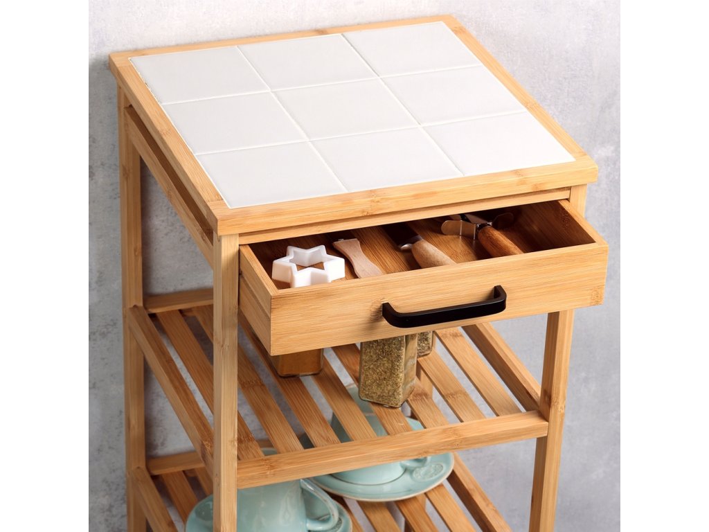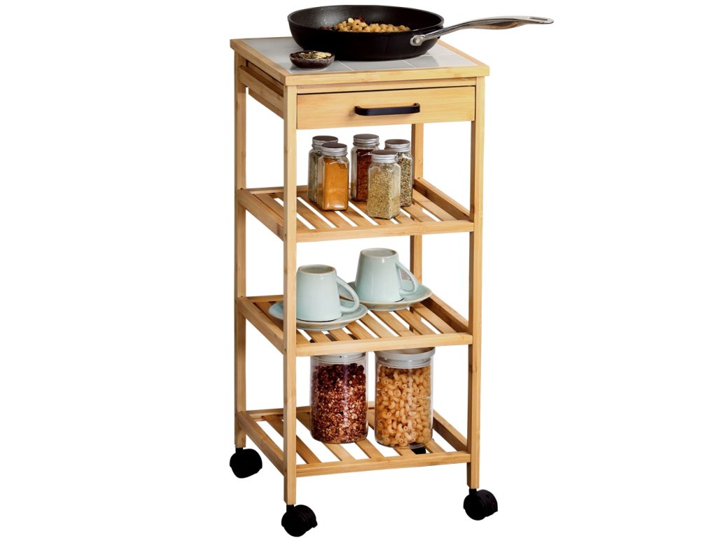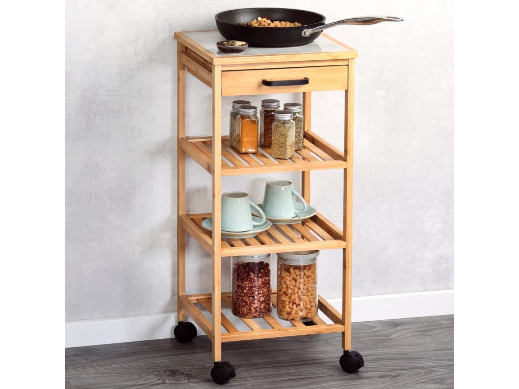 Kuchyňský vozík s bambusovými kolečky, policemi a zásuvkou značky KESPER - praktické řešení pro malé kuchyně s multifunkční konstrukcí