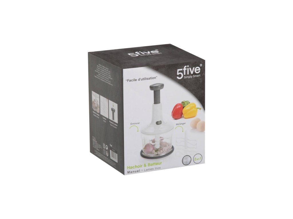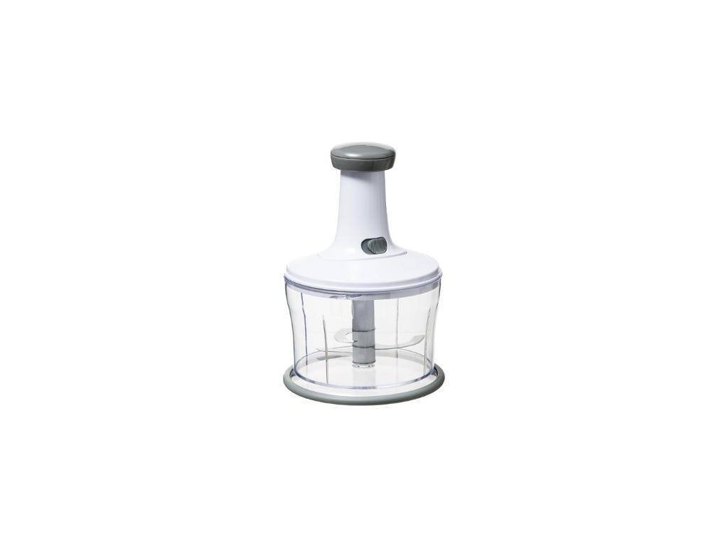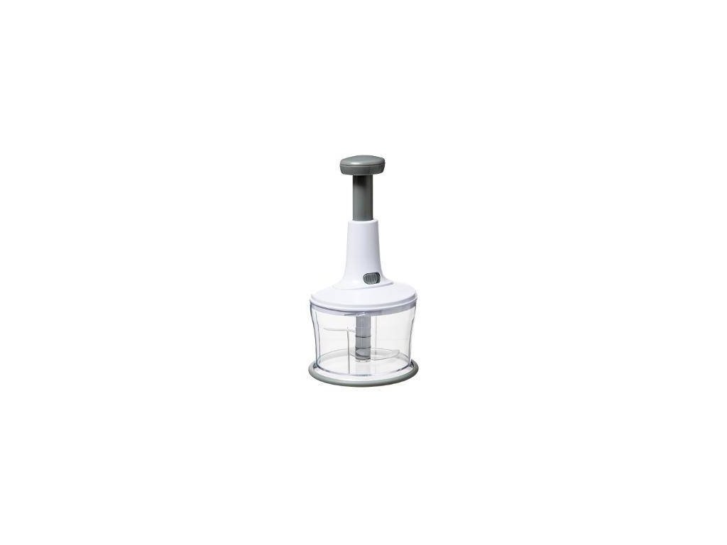 Prezentovaný model má rozměry 15 cm x 22,5 cm (průměr x výška). Je ideální pro rychlé sekání a krájení zeleniny a bylin. Ruční malaxer je velmi jednoduchý: stačí dát výrobky do komory, zakryjte ji horní částí a poté stiskněte píst, který spustí lopatky. Výrobek v bílé barvě.