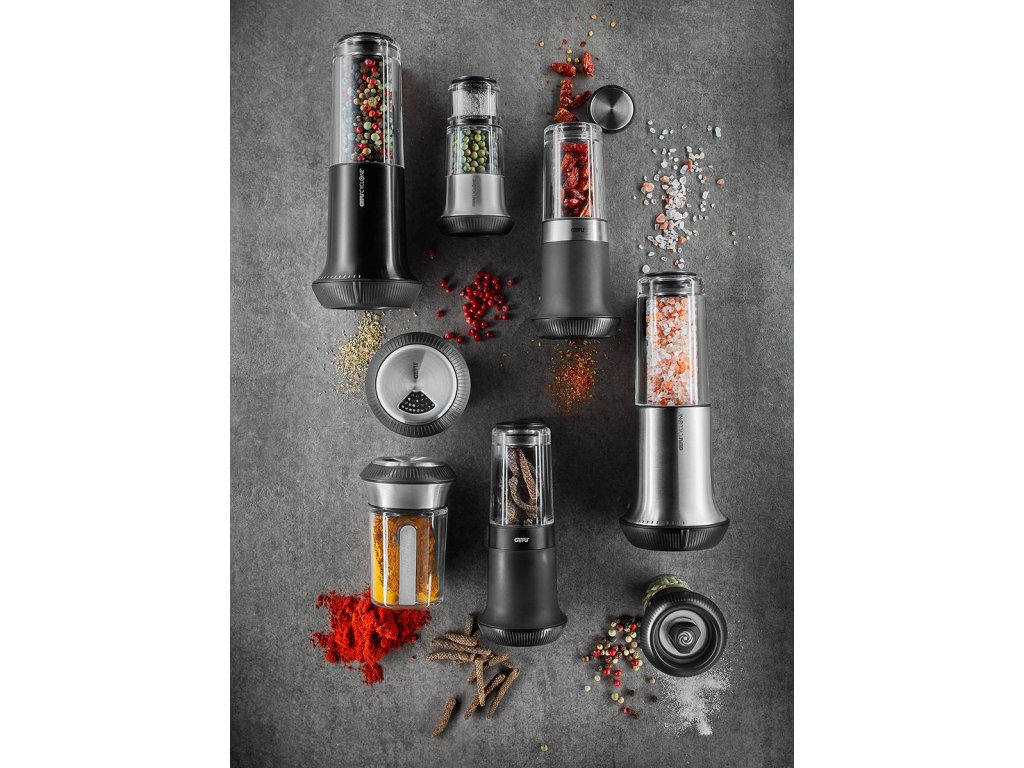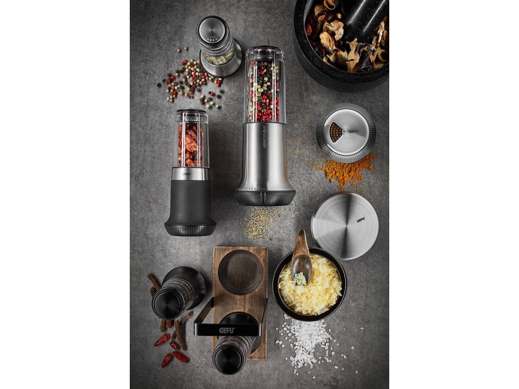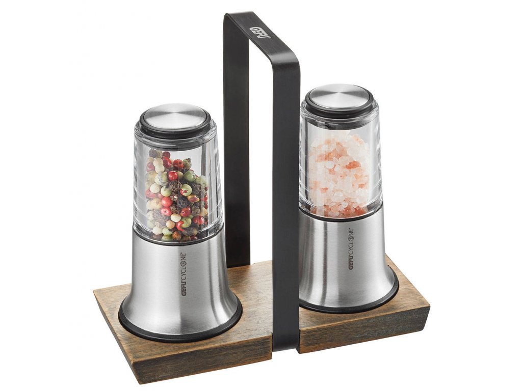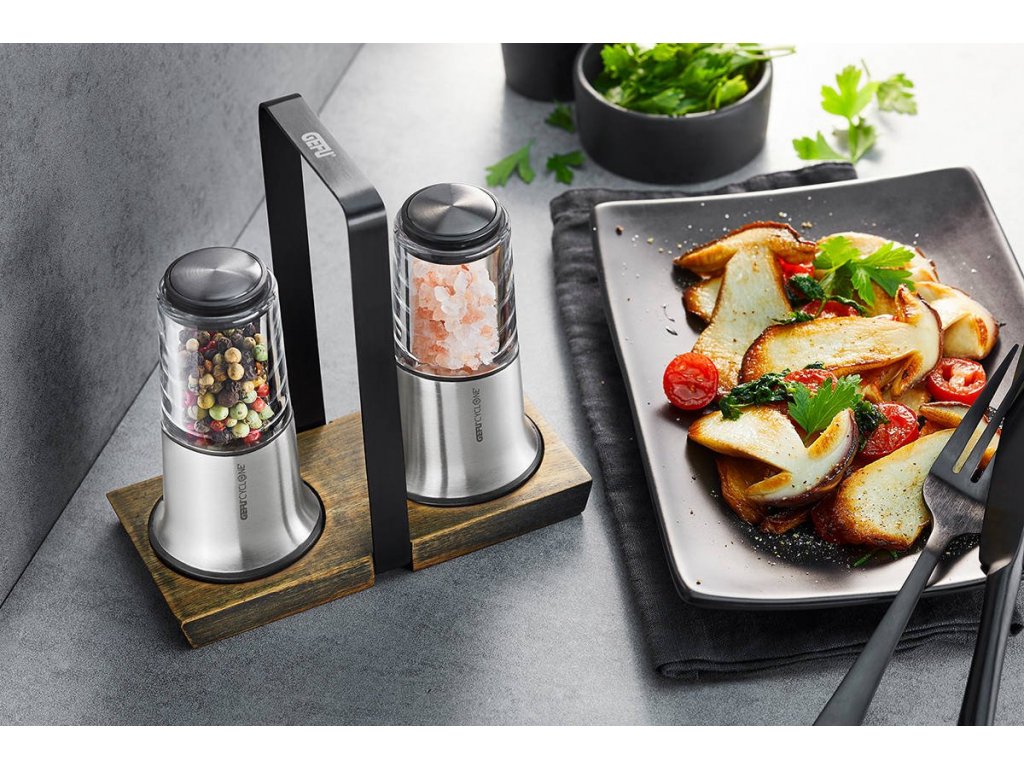 X-PLOSION® mlýnek na sůl a pepř od známé německé značky Gefu jsou vyrobeny z kombinace nerezové oceli a skla na dřevěném podkladu. Díky tomu se zařízení nejen zdají módní a zajímavé, ale také jsou trvanlivé a trvanlivé. Kromě toho je použití takových materiálů skvělé pro kontakt s potravinami. Pevná nádrž zaručuje vůni a svěžest pepře a chrání před nadměrnou vlhkostí a shlukem krystalů soli.