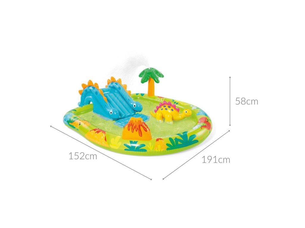 - Spousta zábavy: Bazének má několik funkcí, které zabaví dítě na dlouhé hodiny. Především skluzavka s motivem dvou modrých dinosaurů, která byla zakončena měkkou podložkou. Palma, jako z rájské pláže, je ve skutečnosti sprchou, která po připojení k zahradní hadici ochladí v horkých dnech a zajistí spoustu radosti a smíchu. Dinosaur uvnitř brouzdaliště a sopka jsou další ozdoby, které zpestří celkový dojem a potěší dětské, zvědavé oči.