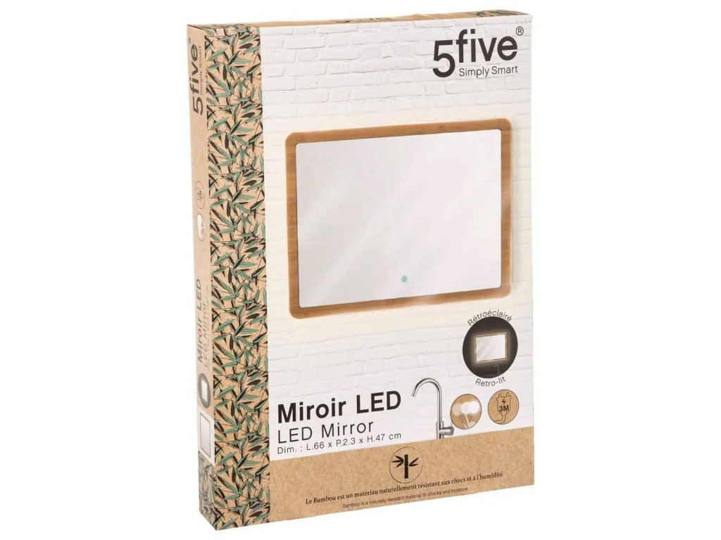 Koupelnové zrcadlo s LED podsvícením je uloženo v odolném bambusovém rámu. Dobře se uplatní v malých, stísněných koupelnách, ale nejen v nich. Jedná se o velmi chytrou dekoraci. Zrcadlo má hladký, bezchybný povrch. Zřetelně se v něm uvidíte. Sklo je stabilně zajištěno rámem.