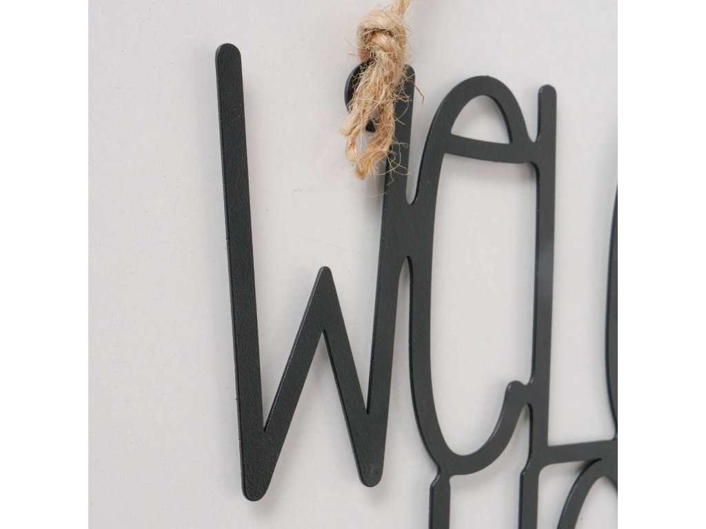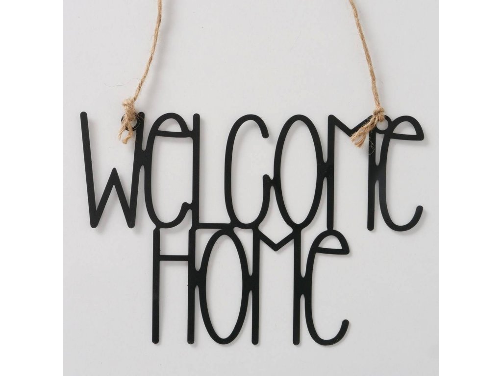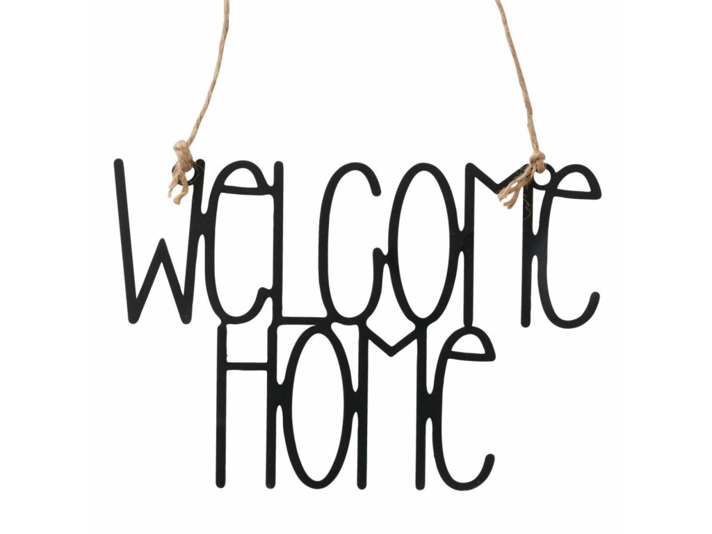 - Kovová deska Welcome Home: Vyrobena z černého kovu o rozměrech 26,5 x 18 cm.