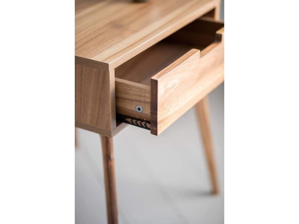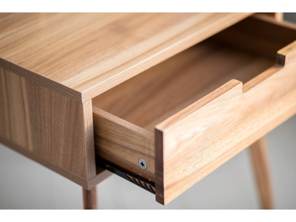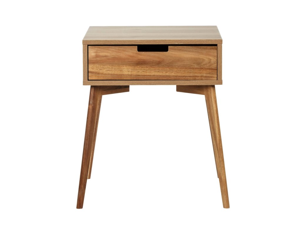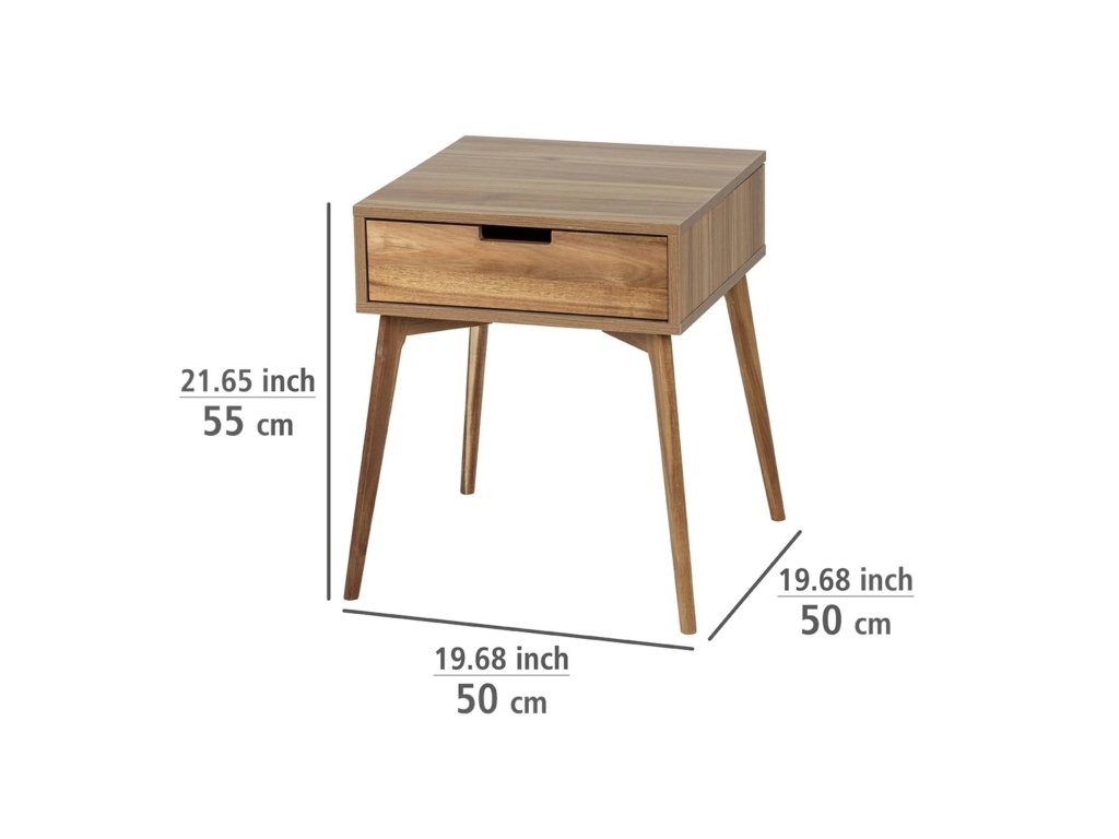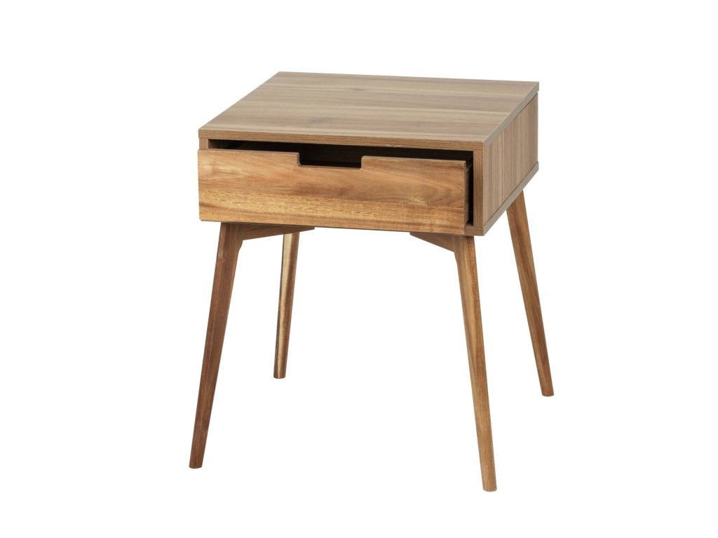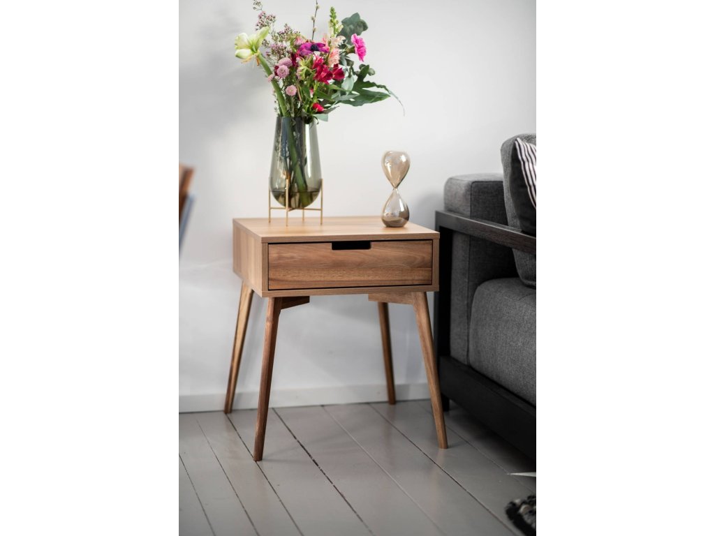 Stolek se nehýbe a stojí pevně díky čtyřem profilovaným, stabilním nohám. Velkým plusem tohoto produktu je jednoduchá, ale praktická konstrukce – stolek má širokou desku, na které lze umístit např. lampičku, a také prostornou zásuvku s profilovaným úchytem.