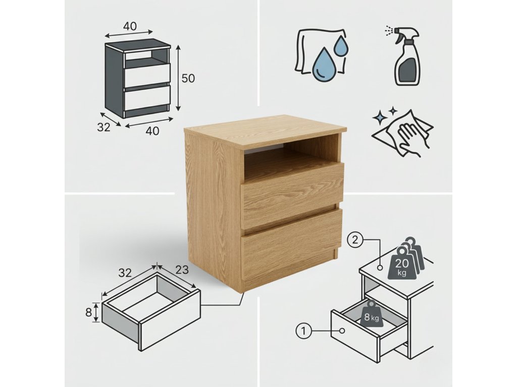 - Vysoká nosnost: S maximálním zatížením 20 kg (8 kg na zásuvku) je stolek AURI dostatečně silný, aby pojmul všechny nezbytné předměty. To je záruka, že vaše věci budou vždy na dosah ruky.