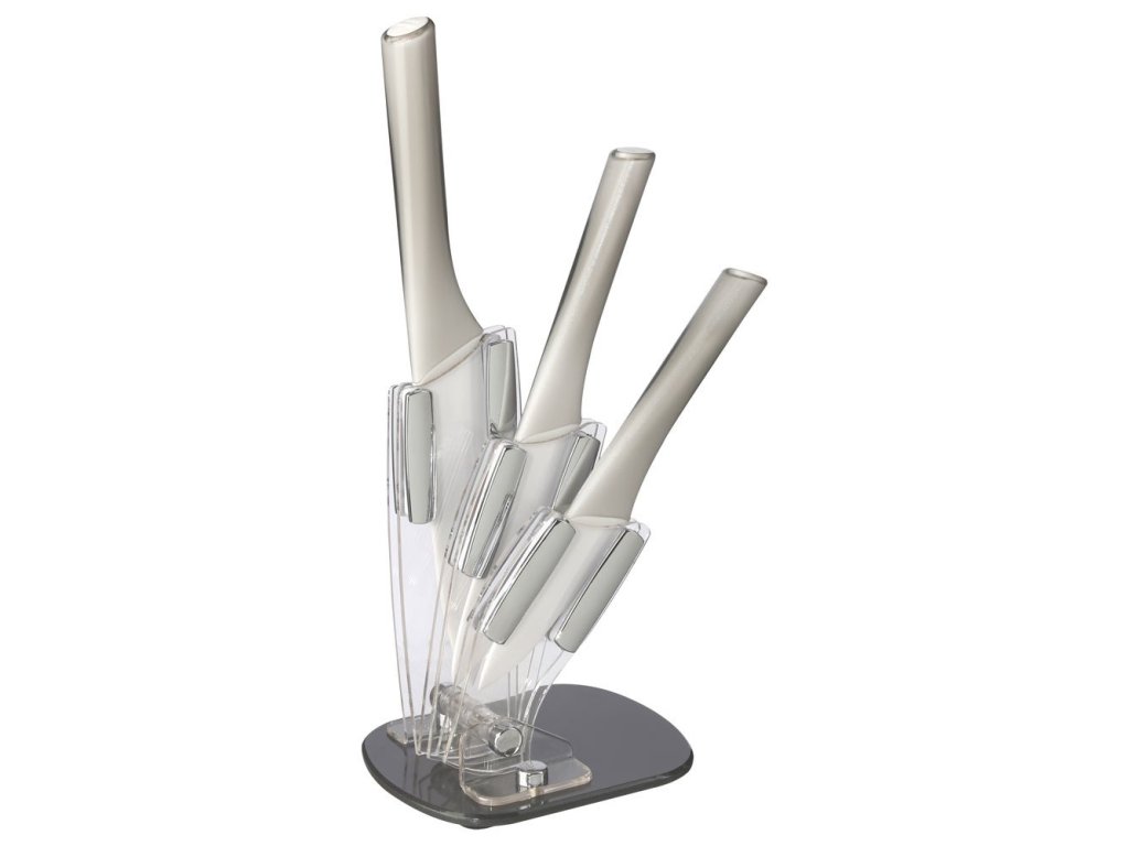 Nože jsou nezbytným vybavením každé kuchyně, a proto stojí za to koupit kvalitní. Sada obsahuje tři univerzální nože s různou délkou keramického ostří (7,5 cm; 10 cm; 12,5 cm). Kvalitní keramika zaručí dlouhou životnost a snadné krájení při přípravě jídla. Díky kvalitní keramice jednoduše a bez námahy nakrájíte moučník, posekáte zeleninu nebo naporcujete maso. Navíc ke keramickým nožům se nelepí krájené potraviny. Rukojeti jsou ergonomické a mají protiskluzový povrch, díky čemu se bezpečně a pohodlně drží v ruce.Skládací šedý akrylový stojan umožňuje bezpečné ukládání nožů a chrání jejich ostří a zároveň svým moderním designem zdobí kuchyňskou linku.