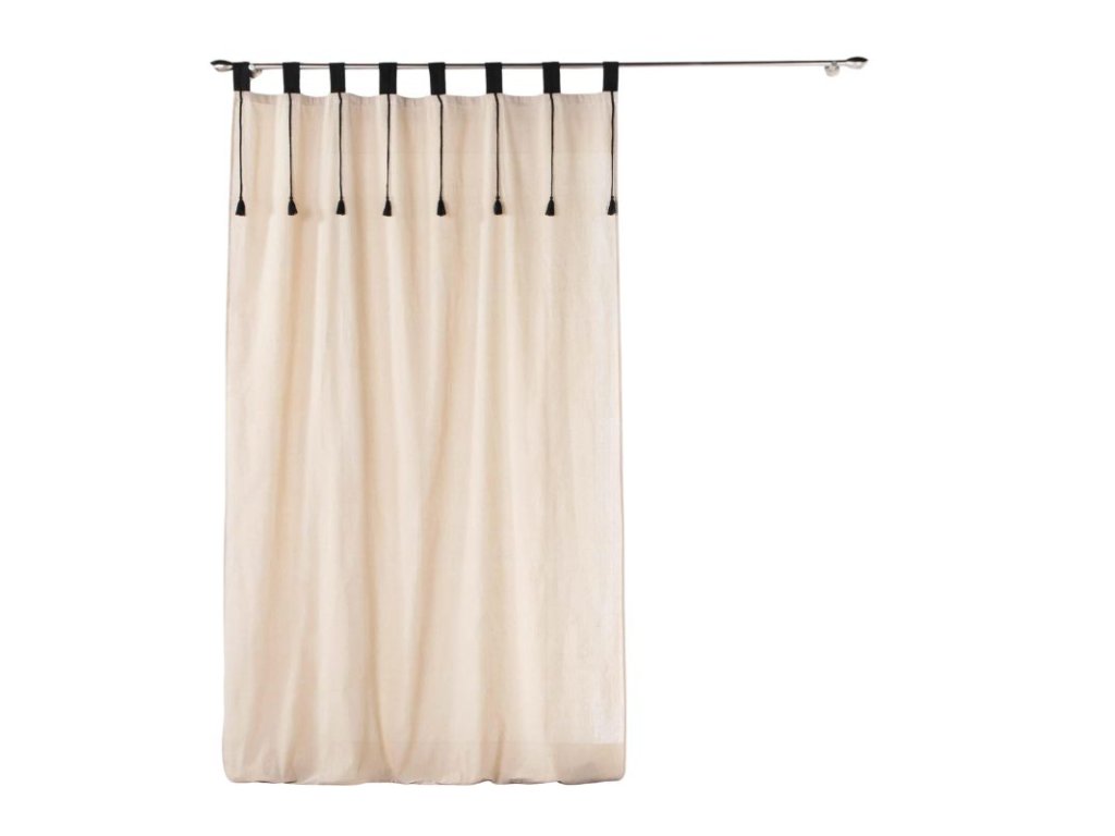 - Závěs v bežové barvě s černými prvky. Ideální pro minimalistické interiéry nebo pro boho styl.