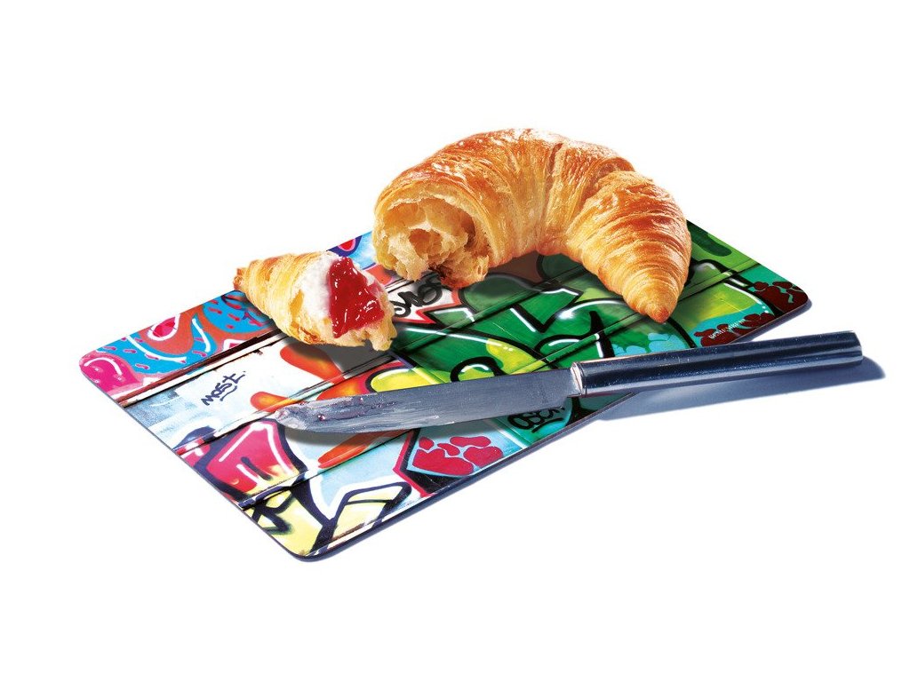 Takováto ozdobná deska na kuchyňskou desku se může stát úžasným dárkem, především pro milovnice současného streetartu. Může být také originálním dekorativním prvkem ve stylové a moderní kuchyni. Krájecí prkénko s takto atraktivním potiskem určitě okouzlí všechny milovníky unikátních dekorativních doplňků a milovníky kuchařského umění. Představené plastové kuchyňské prkénko „Graffiti“ pochází z kolekce z hlediska designu výjimečných položek německé značky Remember. Toto barevné prkénko z melaminu vás okouzlí nejen fantastickou prezentací, ale také svou funkčností. Bylo vytvořeno ze silného, proti vysoké teplotě a poškrábání odolného plastu. Surovina použitá k zhotovení tohoto krájecího prkénka je silná, hygienická a bezpečná při kontaktu s potravinami.