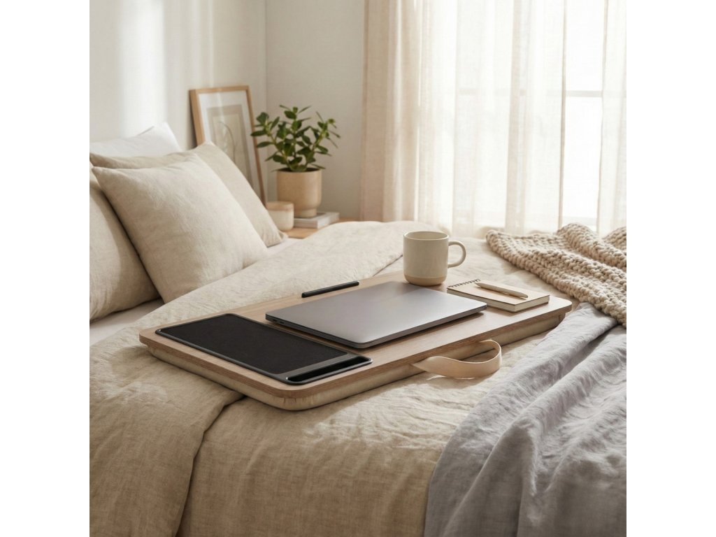 Víceúčelový stůl pod laptop s polštářem a příslušenstvím - ideální řešení pro pohodlnou práci na různých místech