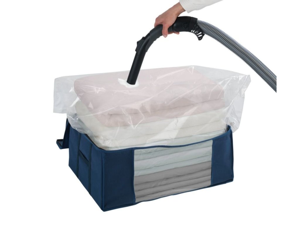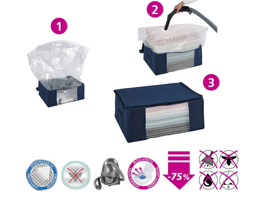 - Se zabudovaným vakuovým pytlem: Uvnitř obalu se nachází vakuový pytel, díky kterému těsně uzavřete oblečení v něm. Toto řešení umožňuje ušetřit až 75% více místa.