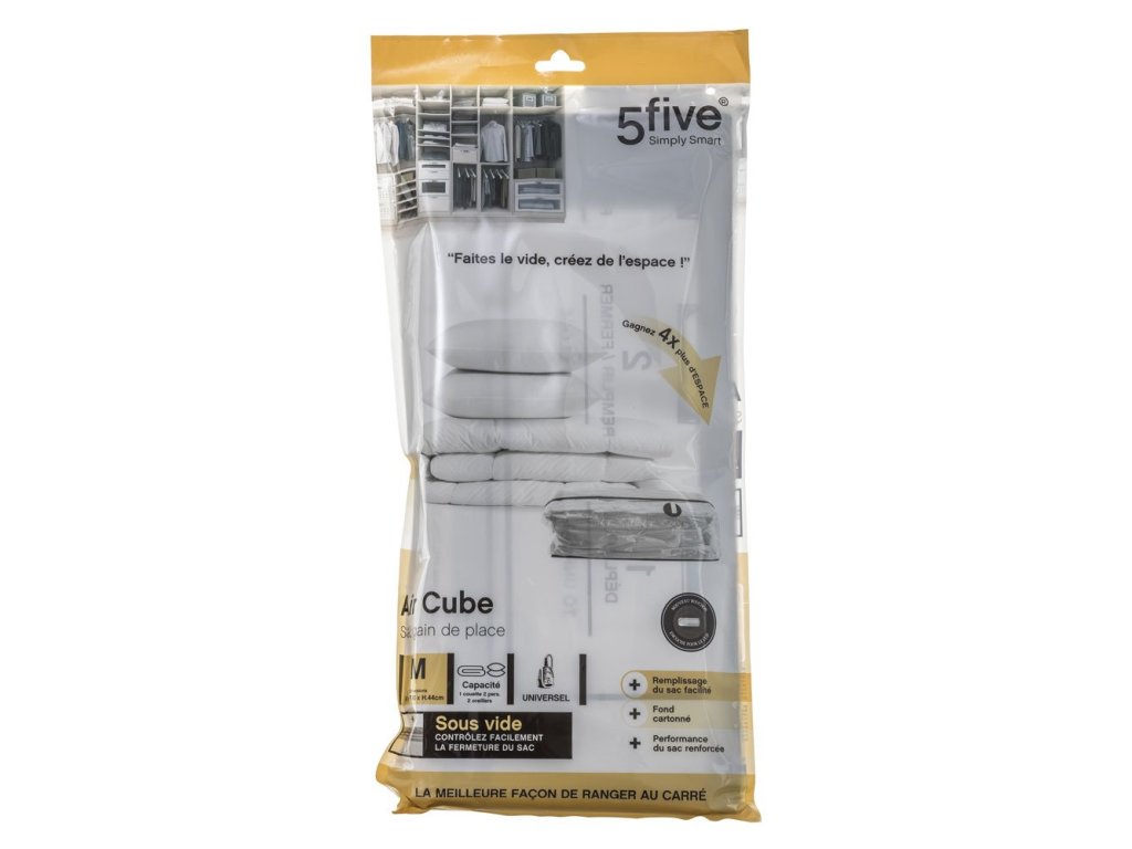 Vakuové balení je spojeno především s velkou úsporou místa v úložných prostorách. Vakuový pytel dokáže nejen podstatně snížit objem oblečení, svetrů, dek, ručníků nebo ložního prádla, ale také je spolehlivě ochrání nejen před zaprášením. Plastové pytle znemožní napadení šatními moly. Je to skvělá ochrana proti těmto škůdcům. Ochrání textil také před nepříjemným pachem a vlhkostí a následným plesnivěním. Vaky od kvalitní značky Five se skvěle uplatní v každé skříni, šatně, úložném prostoru pod postelí nebo ve sklepě či na půdě. Uložte si do nich v teplém období zimní oblečení a naopak. Tyto praktické vaky Vám také pomohou s balením na cesty. Když si podstatně zmenšíte objem, vejde se Vám do kufru více oblečení a můžete si zabalit vhodné oblečení ke každé příležitosti. Tyto velké vaky jsou vyrobené z kvalitní umělé hmoty. Průhledné stěny umožní snadno a rychle najít hledaný kus ošacení. Pytle jsou opatřeny hermetickým zámkem a odsávacím ventilem, který je kompatibilní s každým standardním vysavačem.
