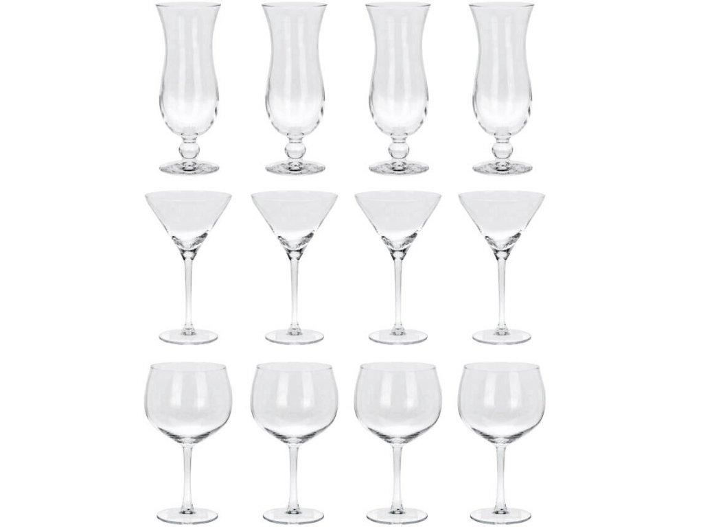 - Sada: Kompletní soubor 12 sklenic, obsahující 3 různé typy sklenic: Martini, Gin Tonic a Hurricane, ideální pro podávání různorodých drinků.