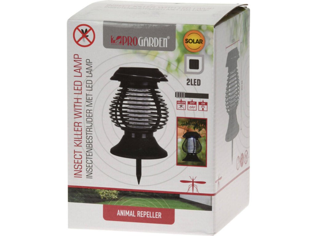 Produkt je vyroben z materiálů odolných vůči vnějším vlivům. Lampa proti hmyzu PRO 2 v 1 – kombinuje funkci proti hmyzu a dekorativní funkci. Má kolík, díky kterému ji lze zapíchnout do země. Produkt je napájen pomocí AA baterií a solárního panelu. Velkou výhodou tohoto doplňku je možnost libovolného uspořádání: lampu lze například umístit mezi keře nebo zapíchnout do květináče s balkónovými rostlinami.