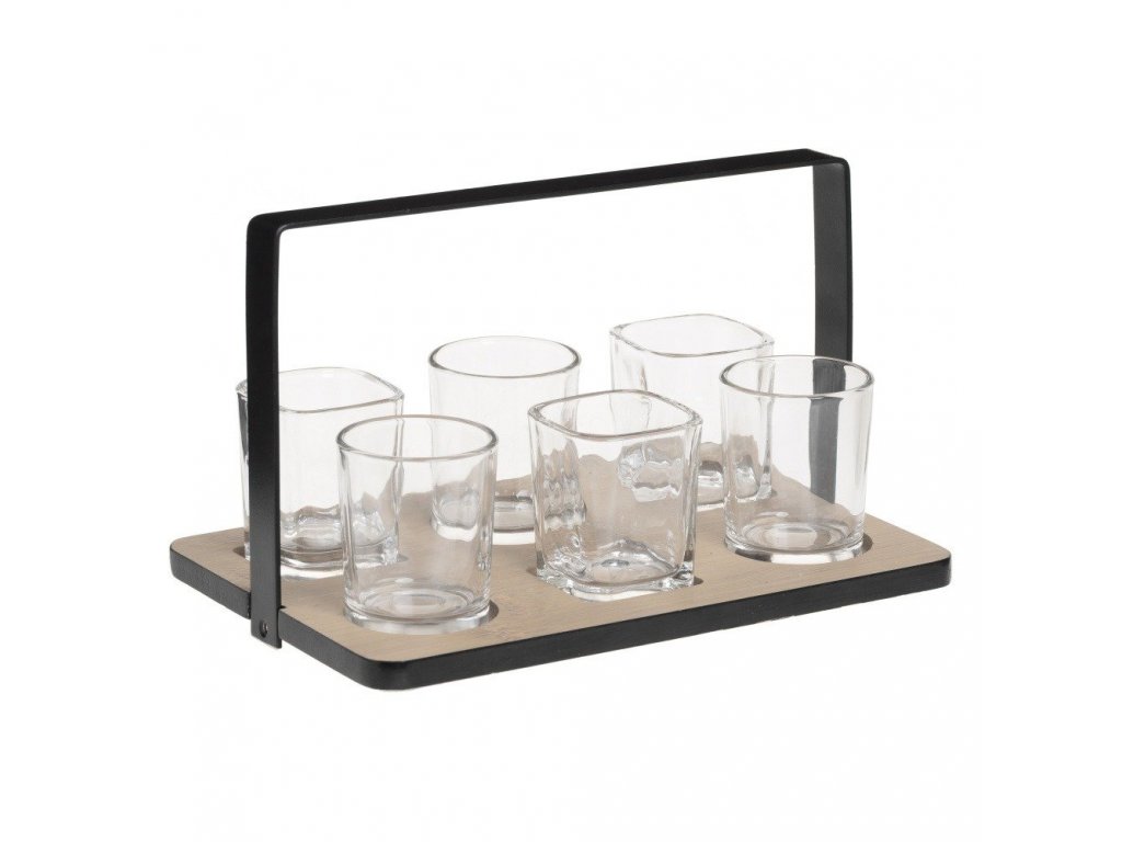 - sestává z bambusového podnosu s kovovou rukojetí a šesti bezbarvých brýlí