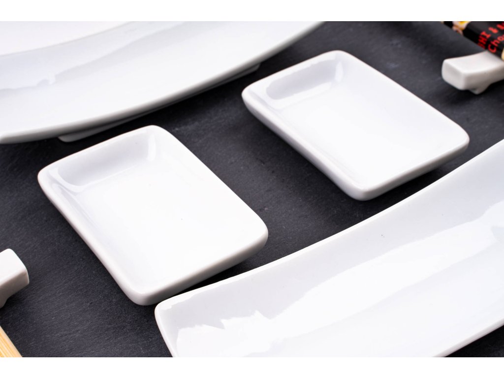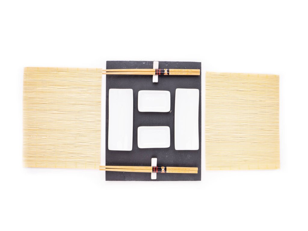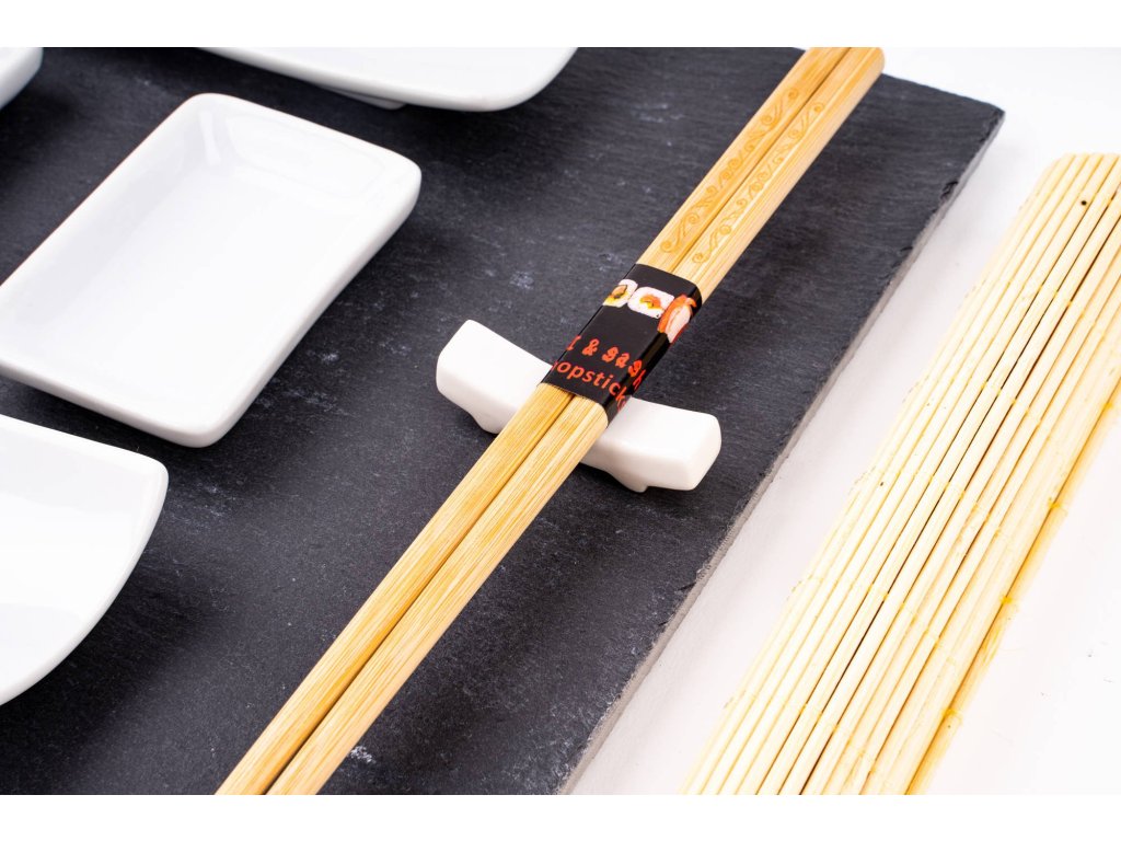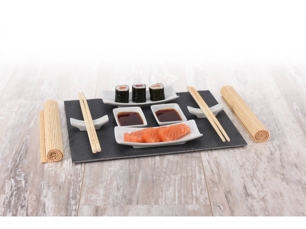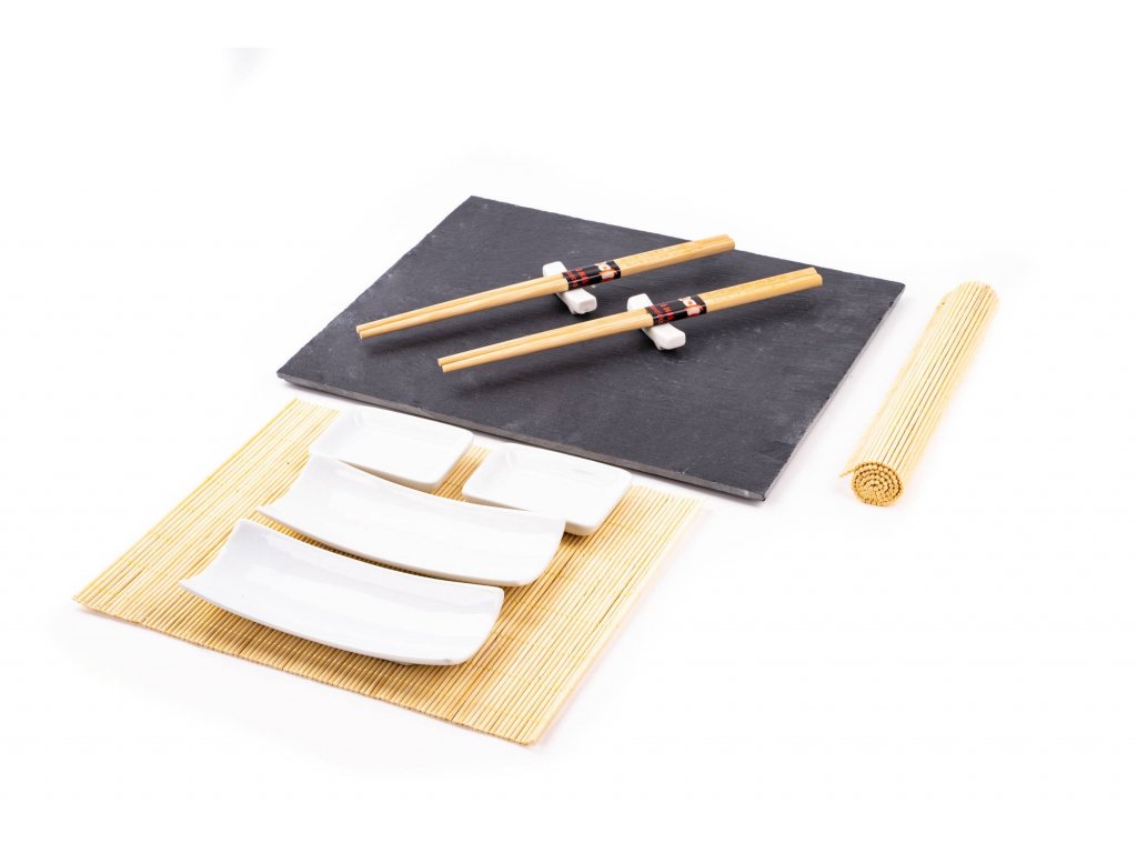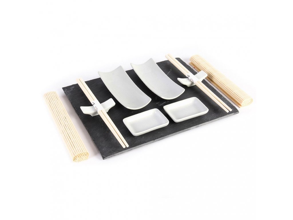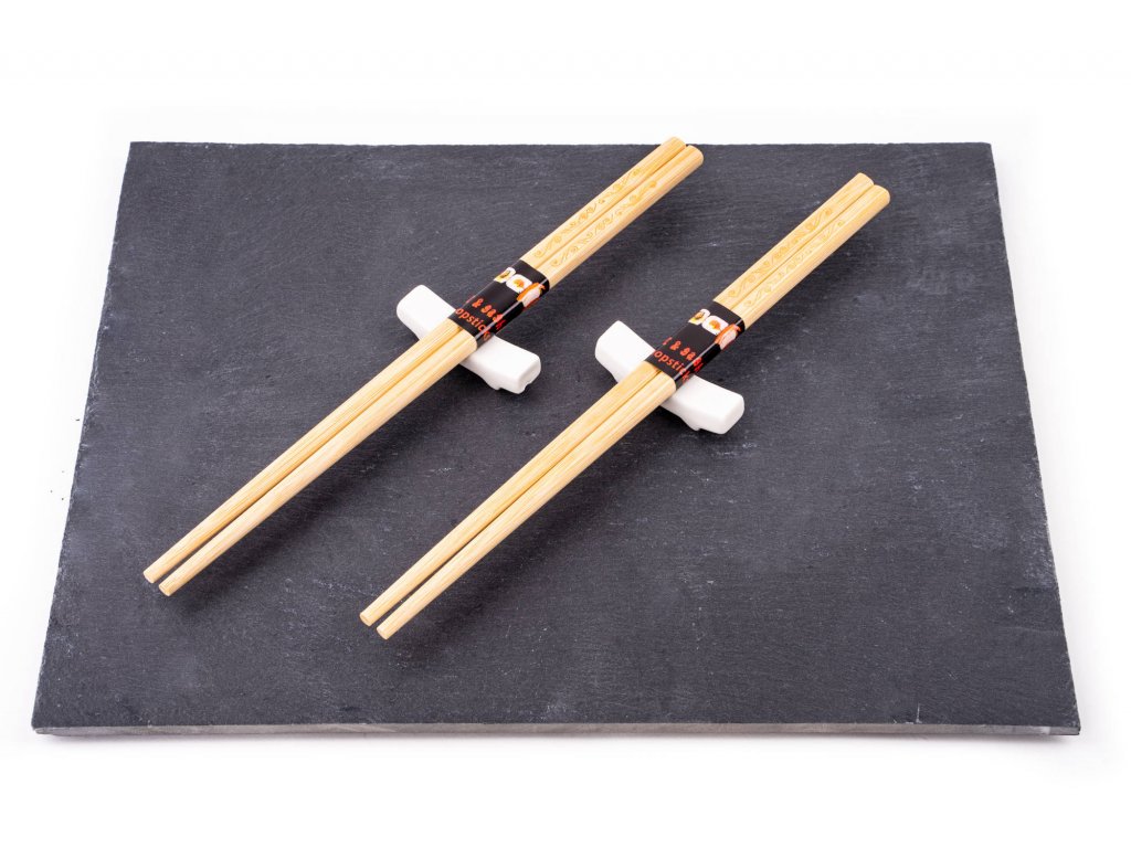 Originální sada na servírování občerstvení na kamenném podkladu stylizovaném na łupek. Hodí se k podávání sushi a také slaných předkrmů. Sada se určitě najde uplatnění během rodinných a společenských setkání. V sadě jsou 2 porcelánové misky, 2 podložky a dřevěné hůlky a bambusové podložky. Produkt se také osvědčí jako originální nápad na dárek.