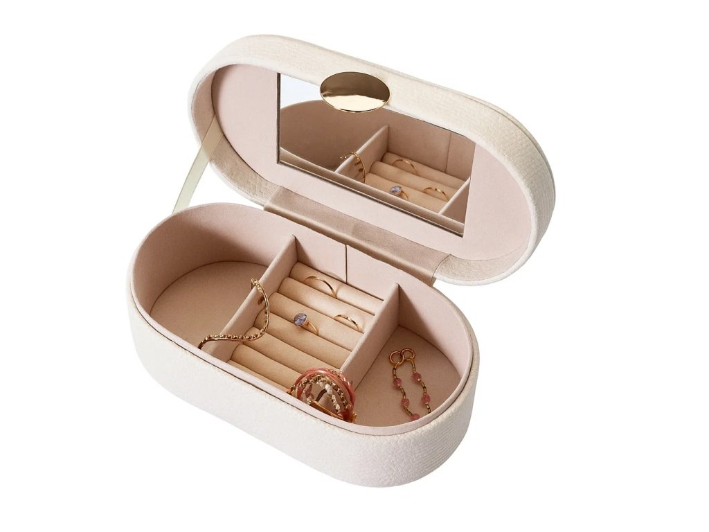 - Vestavěné zrcadlo: Šperkovnice má zrcadlo uvnitř víka, což usnadňuje výběr šperků k oblečení. Díky tomu můžete rychle a pohodlně zkontrolovat, jak vypadají vaše oblíbené doplňky.