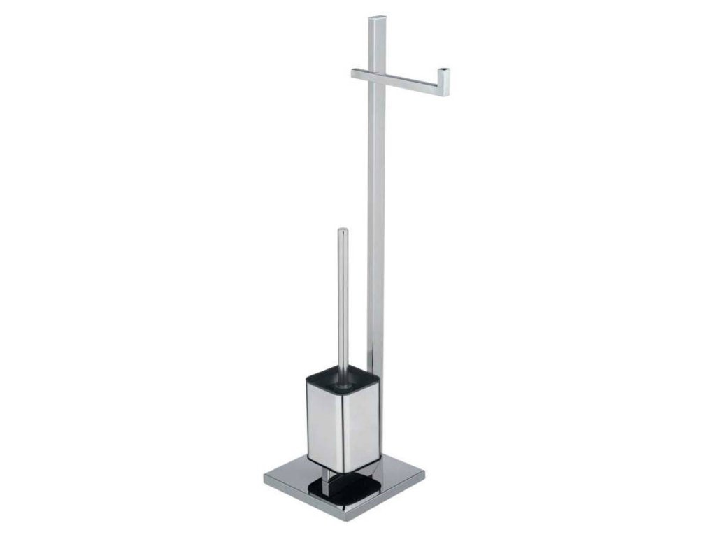 Elegantní koupelnový stojan spojuje držák na toaletní papír a nádobu na WC štětku. Vyznačuje se estetickým designem. Skvěle se hodí do každé koupelny. Umístěn vedle toalety bude plnit praktickou i estetickou funkci. Koupelně dodá elegantní charakter a udrží papír a štětku na snadno dostupném místě. Snadná montáž. Pečlivě vyrobený. Stabilní čtvercová základna (18 x 18 cm) zabraňuje převrácení. Konstrukce je vyrobena z chromované oceli. Nádoba na štětku je vyrobena z snadno udržovatelného plastu.