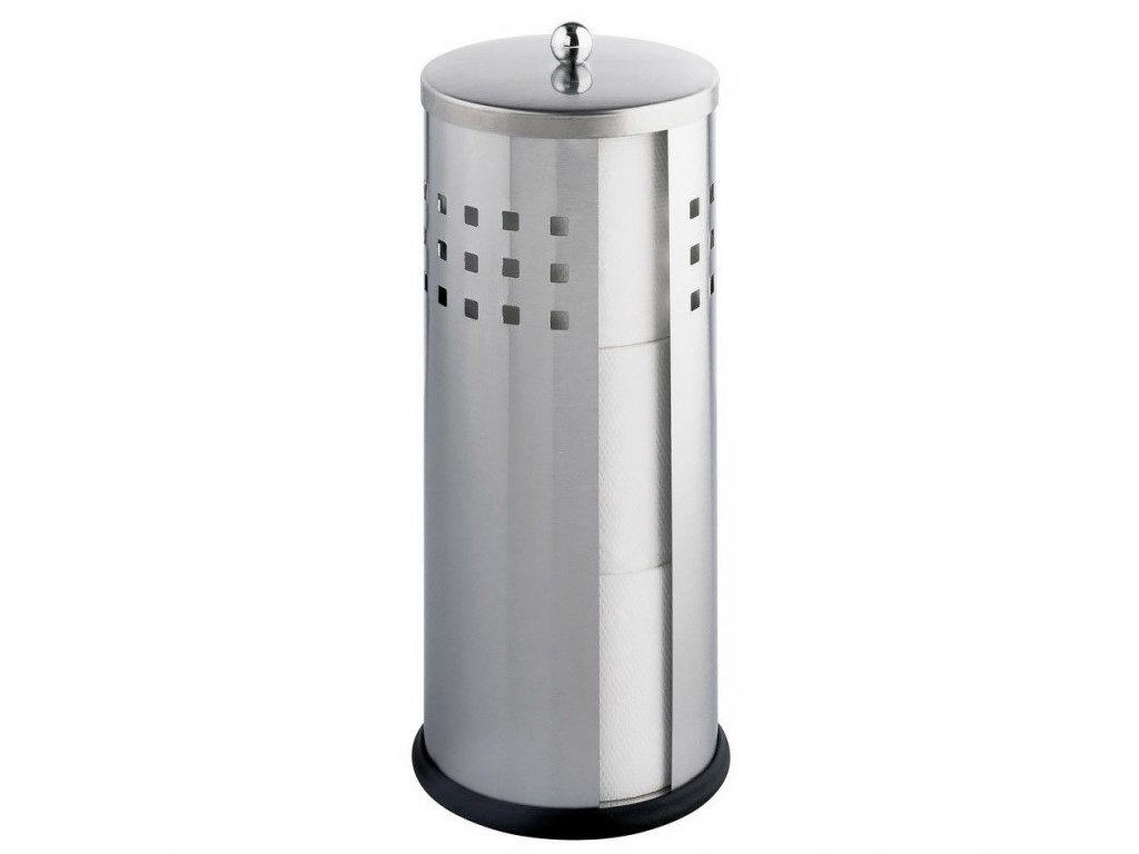 Elegantní koupelnový držák na toaletní papír. Pojme až 3 role a zajistí, že papír bude vždy po ruce. Vybaven víkem a otvorem pro snadné sáhnutí po papíru. Vysoce kvalitní, matná nerezová ocel. Spodní část z protiskluzového plastu.