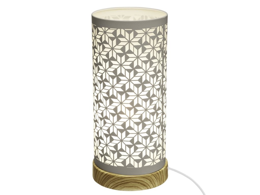 stolní lampa dekorativní stolní lampa, tvar válce, difuzor s geometrickými vzory, stabilní dřevěný podstavec šedá barva