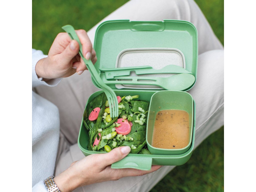 - 3 prvky, které můžeš používat dohromady nebo samostatně: Součástí sady je velký obědový box. Jeho doplňkem je malá nádoba na dresink nebo omáčku na salát. Vejde se dovnitř nádoby. K sadě jsou přiloženy příbory.