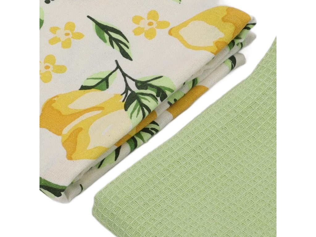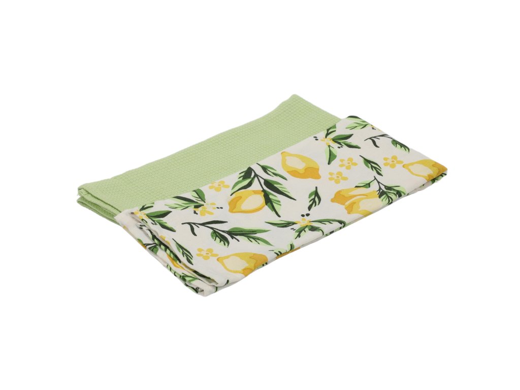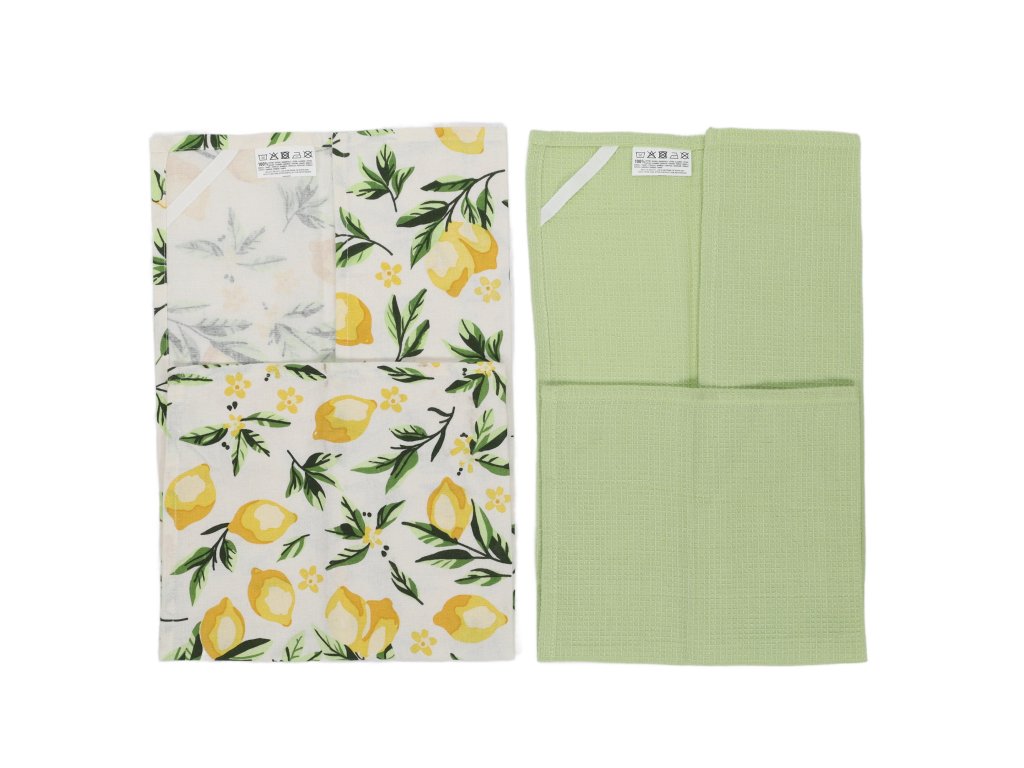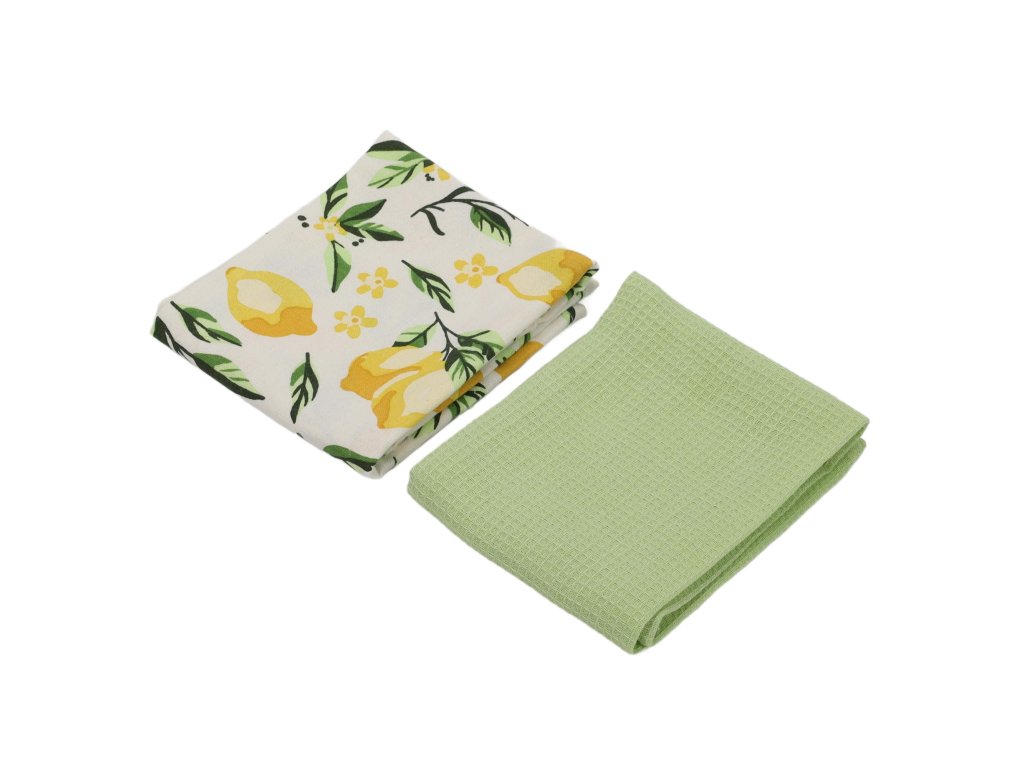- Stylový design: Sada se skládá ze dvou utěrek – jedna s potiskem citronů a listů, a druhá v jednolitém světlém zeleném odstínu s vaflovou strukturou. Díky tomu dodají svěžest a barvu vaší kuchyni.
