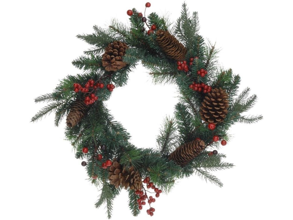 - Přirozený vzhled: Zelené větvičky, šišky a červené bobule dodávají věnci realistický vzhled a přinášejí sváteční kouzlo do každého interiéru.