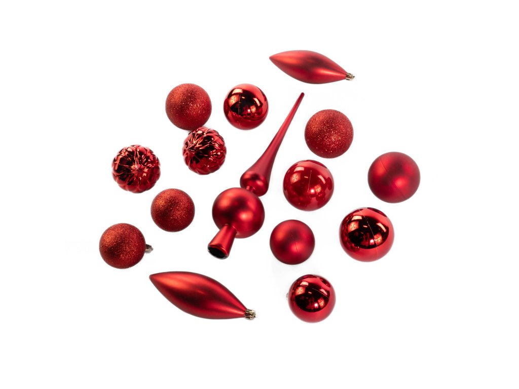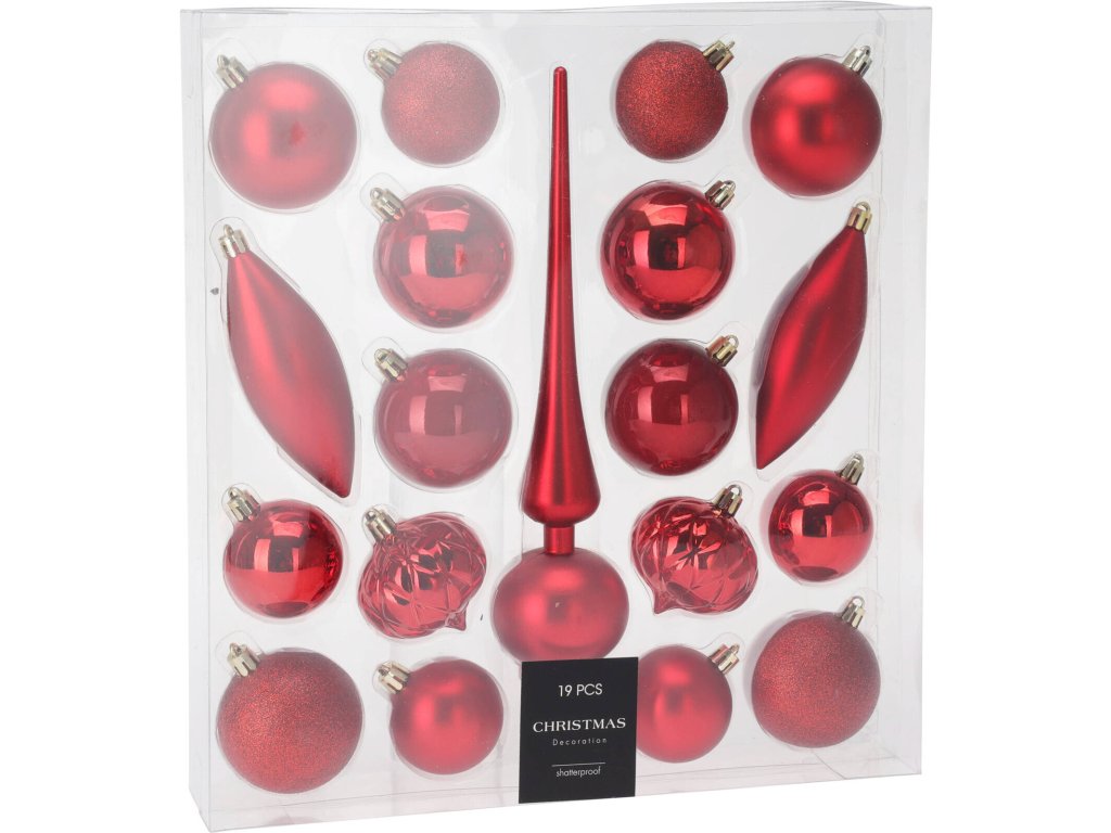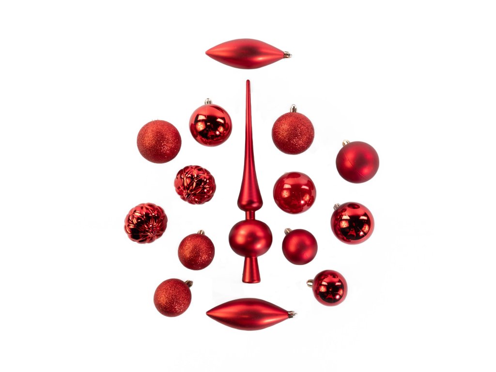 Sada ozdobných koulí různých tvarů s špičkou na vánoční stromek, 19 ks, červená