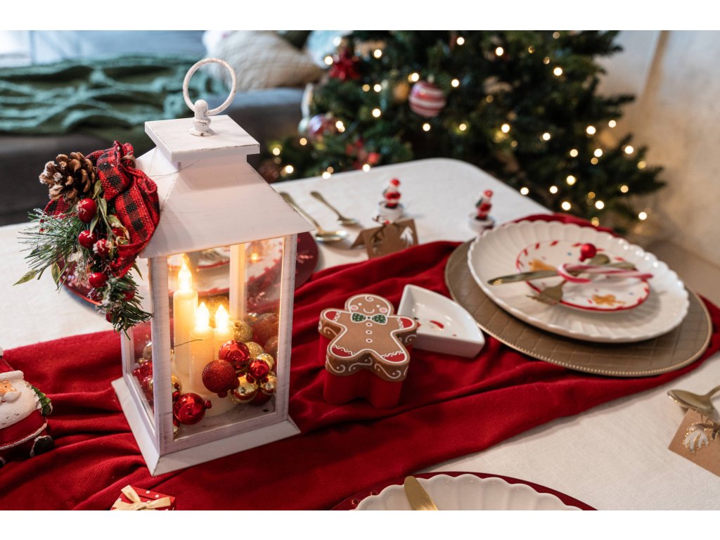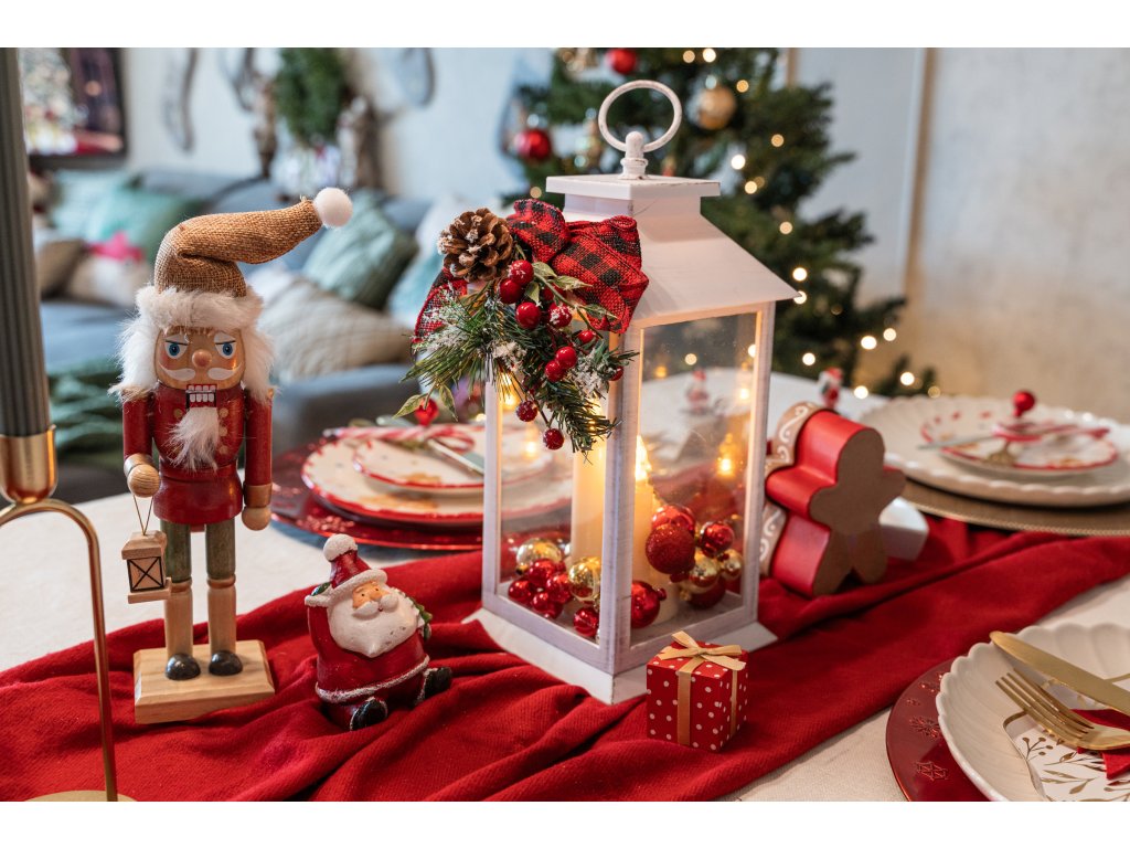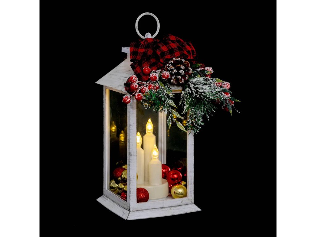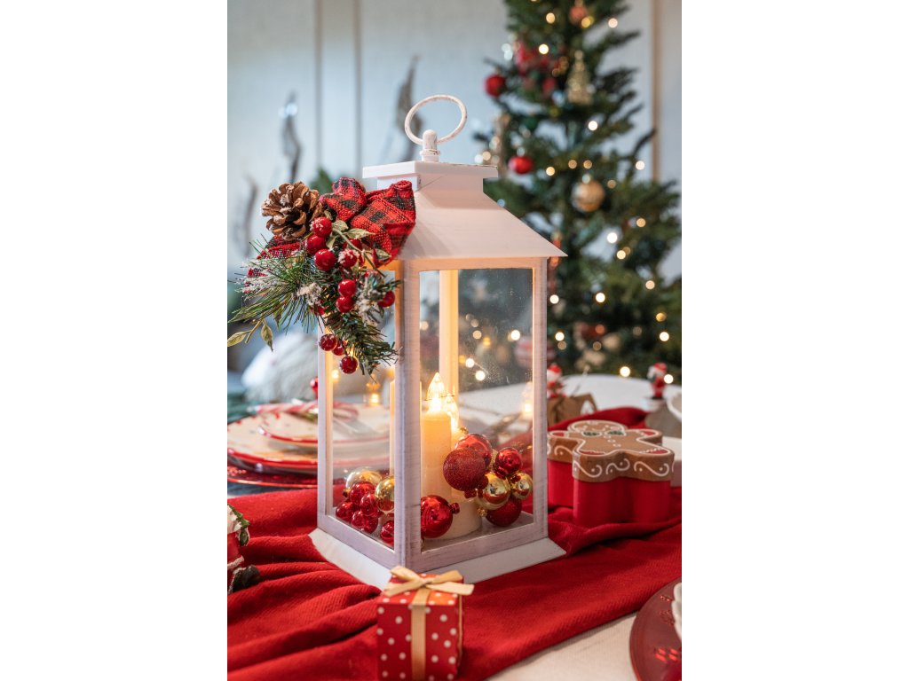 - Tvar skleněného lampionu: Dekorace má tvar lampionu, uvnitř se nacházejí umělé svíčky a barevné ozdoby, a zvenčí - posypaná umělým sněhem dekorace ve formě zelených větviček s ozdobami.