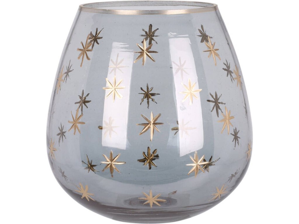 Skleněný svícen na čajové svíčky s dekorativními zlatými hvězdičkami - elegantní design, který vnáší útulnou atmosféru do každého interiéru.